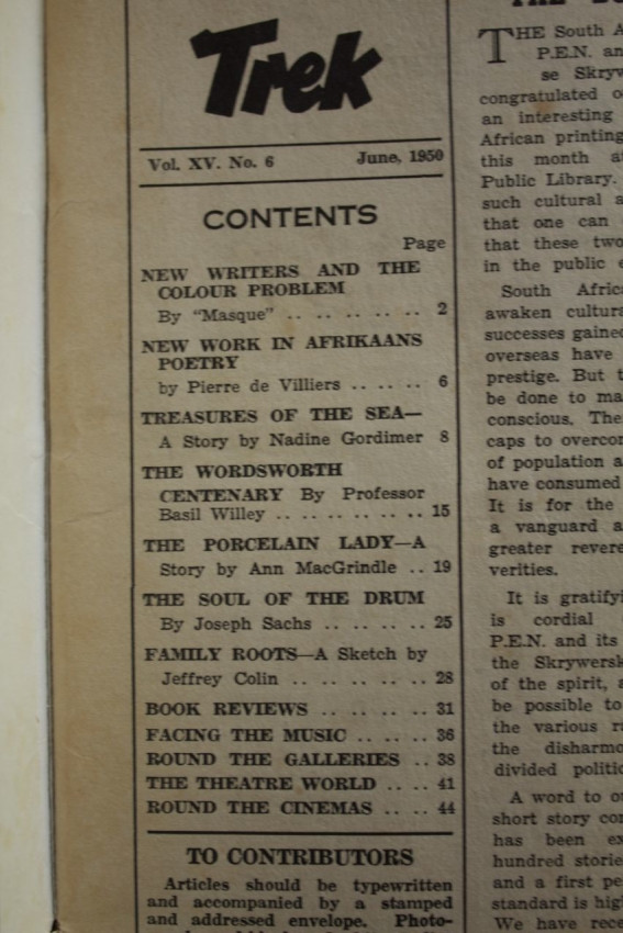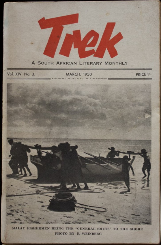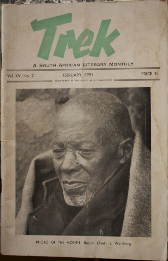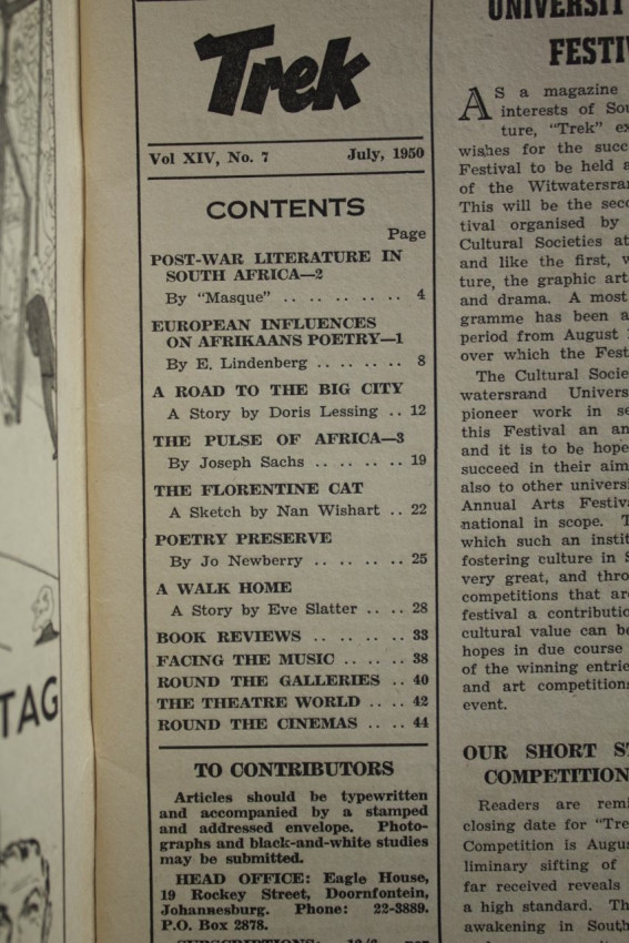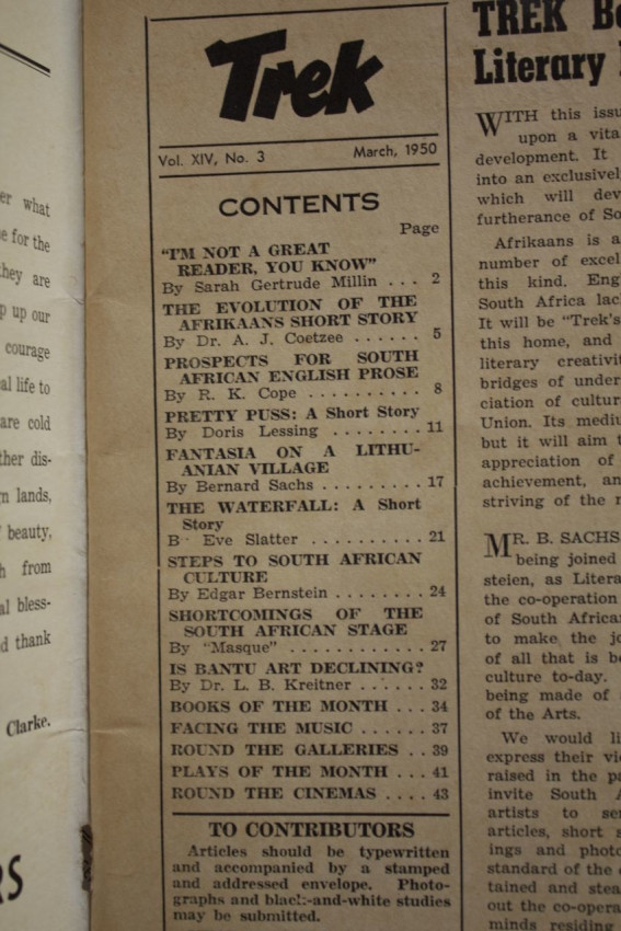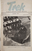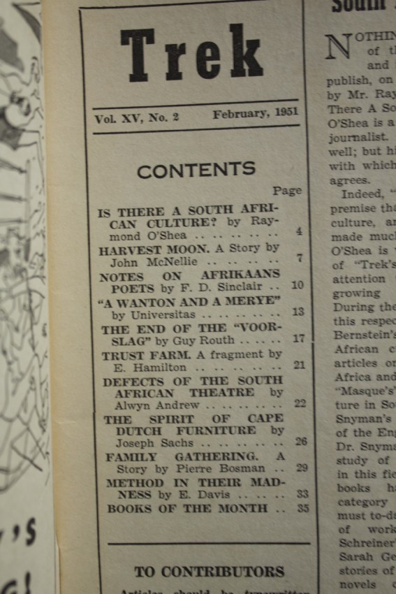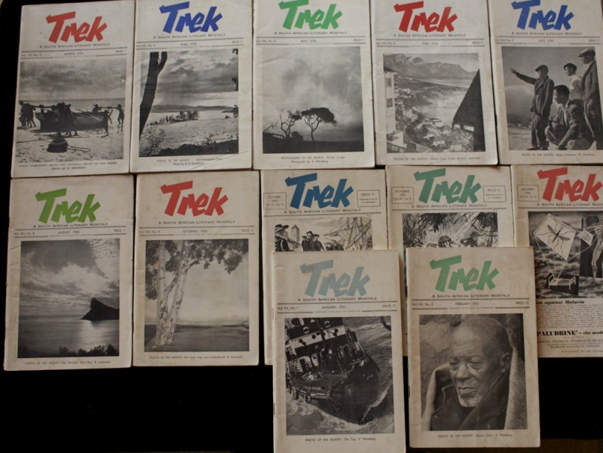Trek magazine was a bi-monthly literary review with left-liberal inclination. In 1947 Trek merged with The South African Opinion after the latter was forced to close down for financial reasons. The two magazines would have a significant impact on SA's literary life as it gave many young writers a platform; The South African Opinion cemented Herman Charles Bosman's status as one of SA's foremost short-story writers and Trek contained some of the earliest prose by two Nobel Prize-Winning authors.
