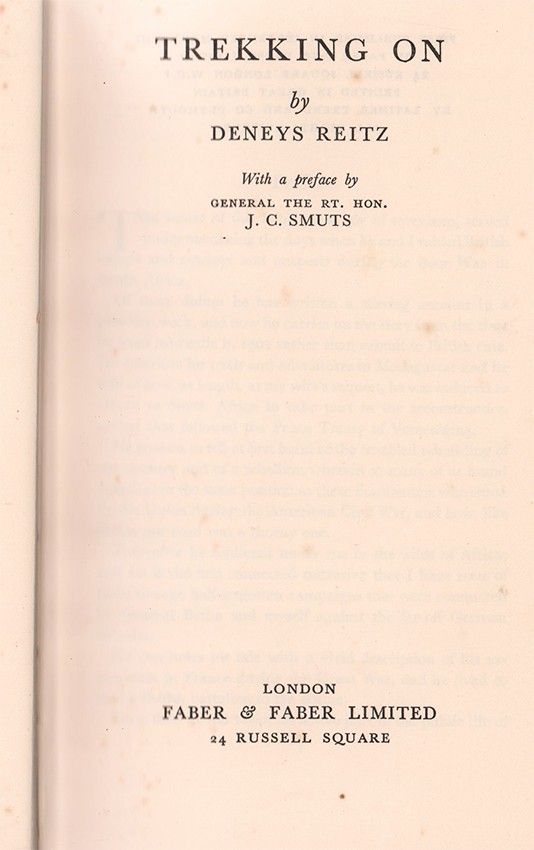 Signed Signed, 'Deneys Reitz, 1935' on the half title page.