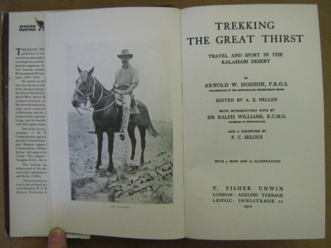 Books of Zimbabwe reprint of the original 1912 edition. Eighteen chapters detailing the author\'s travels and hunting adventures in the Kalahari, Damaraland, Botswana, with dozens of photographs and four fold-out maps of the areas concerned.