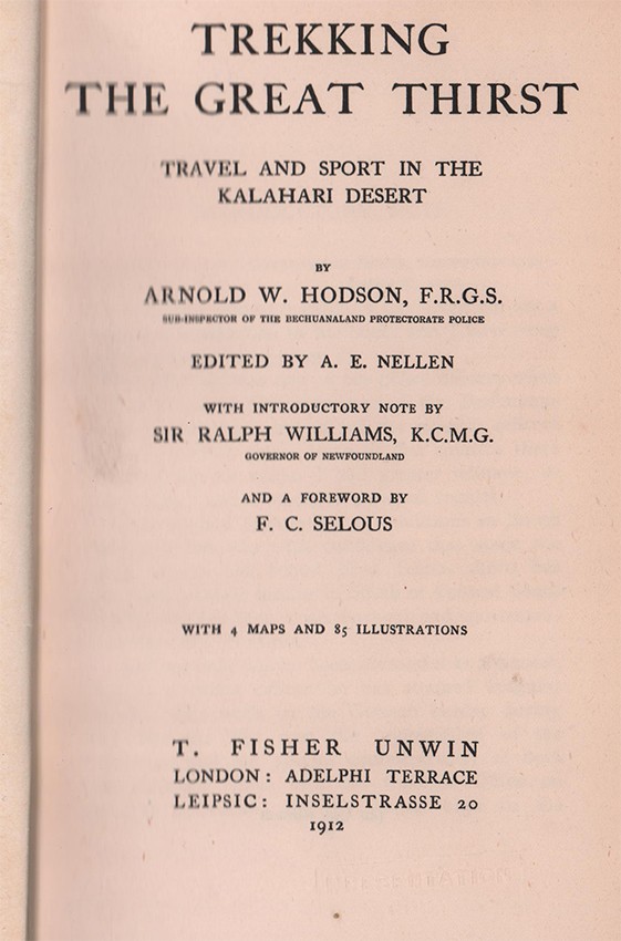 F.C. Selous writes in his foreword, 'Mr Hodson's narrative of his very arduous journeys through the true Kalahari, from Kayne to Lehututu and thence to Lake Ngami and the eastern frontier of Damaraland, deals with regions as little known to geographers and travellers probably as any part of Central Africa today, and it is a country, it must be acknowledged, which is not likely to prove attractive to sportsmen or travellers who study their comfort.