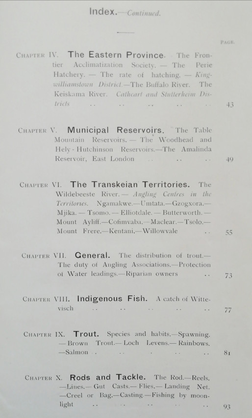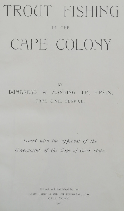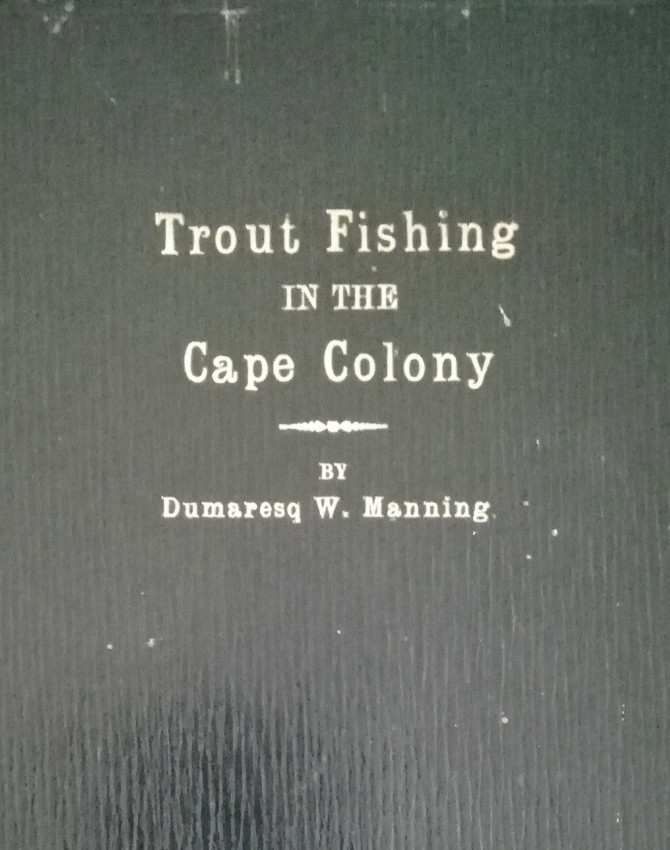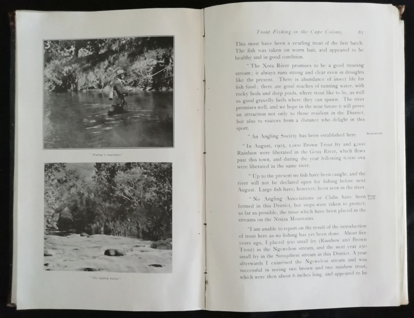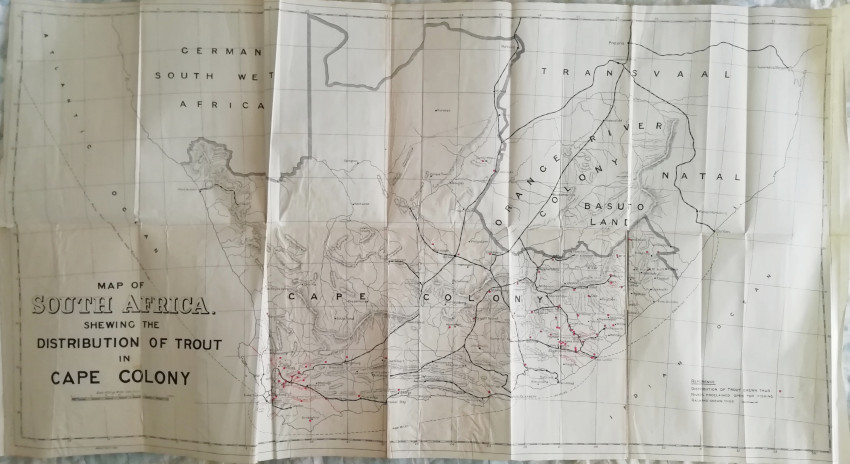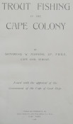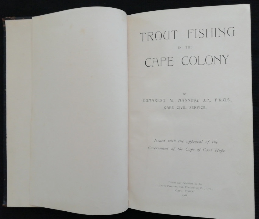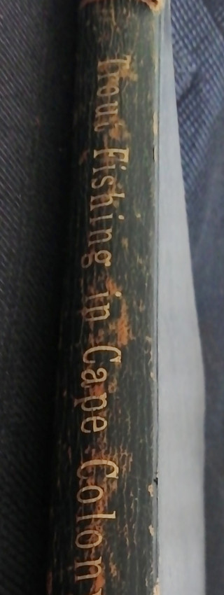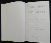 Issued with the approval of the government of the Cape of Good Hope. With a fold-out map shewing the distribution of trout in Cape Colony, the rivers proclaimed for fishing, and lines of railway open for travel. Well illustrated with b&w and color illustrations. Contents: Introduction, The Western Province, Fishing Results, the Eastern Province, Municipal Reservoirs, The Transkeian Territories, General, Indigenous fish, Trout, Rods and taclle. Includes a "Permit for fly fishing". Full leather boards with gilt lettering to front and spine. Board edges and spine worn with some loss, light scattered foxing on first pages and map. Cape Piscatorial Society stamp with inscription on flep. This is probably the oldest title on angling published in Africa.