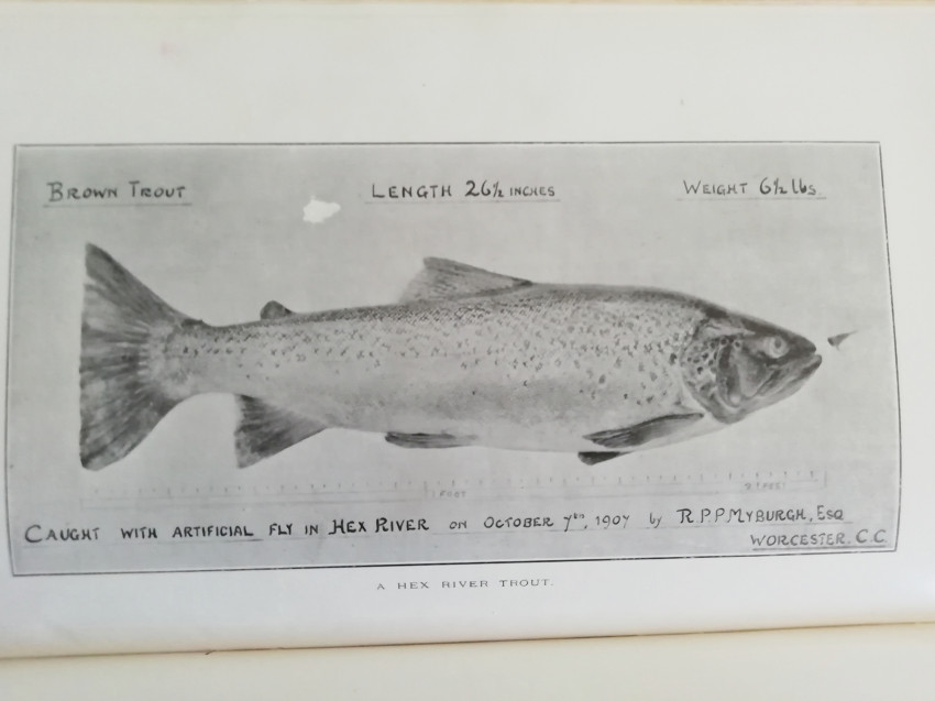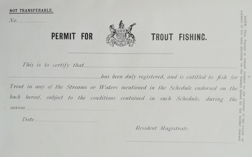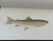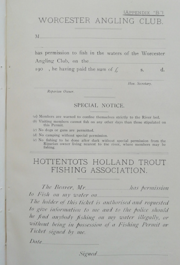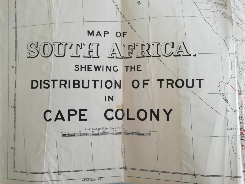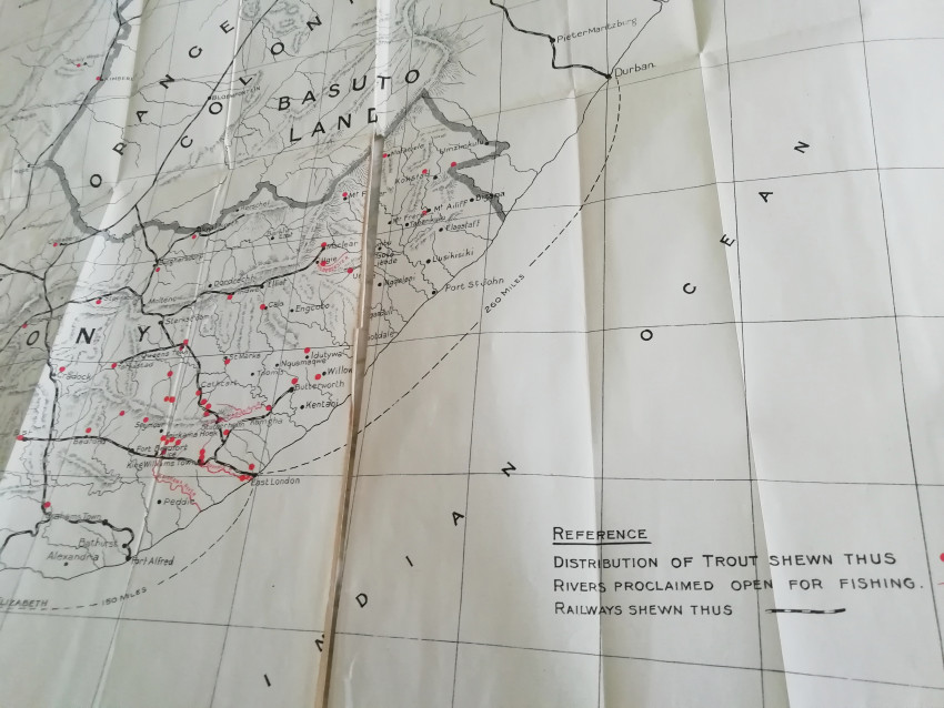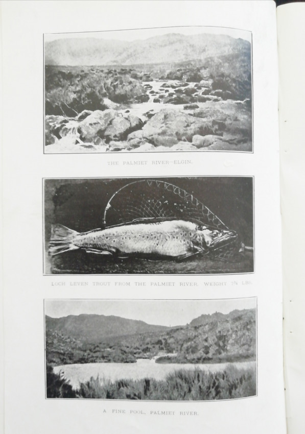 Issued with the approval of the government of the Cape of Good Hope. With a fold-out map shewing the distribution of trout in Cape Colony, the rivers proclaimed for fishing, and lines of railway open for travel. Well illustrated with b&w and color illustrations. Contents: Introduction, The Western Province, Fishing Results, the Eastern Province, Municipal Reservoirs, The Transkeian Territories, General, Indigenous fish, Trout, Rods and taclle. Includes a "Permit for fly fishing". Full leather boards with gilt lettering to front and spine. Board edges and spine worn with some loss, light scattered foxing on first pages and map. Cape Piscatorial Society stamp with inscription on flep. This is probably the oldest title on angling published in Africa.
