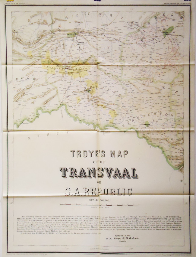 Gustav A. Troye, surveyor, cartographer and consulting engineer compiled a number of important maps of the Transvaal and its gold fields. However, his most important contribution to cartography was Troye's map of the Transvaal or S.A. Republic (1:500 000, on 6 sheets), lithographed in Switzerland and published in six colours in Pretoria. It was the first topo-cadastral map of the Transvaal and by far the most complete, accurate and attractive map of the territory produced up to that time. He used farm diagrams and inspectors' records in the surveyor-general's office to map farm boundaries and list farm names, while information was also obtained from F.H. Jeppe's* map of 1889 https://www.s2a3.org.za/bio/Biograph_final.php?serial=2879