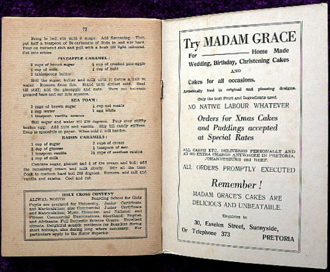 A recipe book that has been especially adapted for sweet making in South Africa with careful attention to required temperatures for the stages of sugar boiling and instructions on how to calculate the temperatures in accordance with the boiling point of the water at the various altitudes in South Africa.