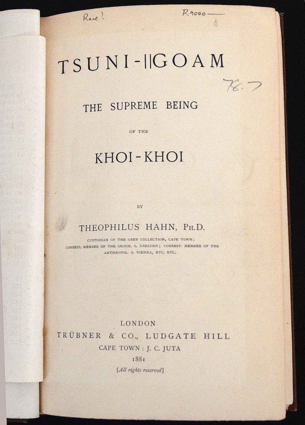A linguistic and folklore study of the Khoikhoi, issued in the publisher's Oriental Series. Scarce in the first edition. Tsuni-Goam is a figure in the Khoikhoi mythology. He is sometimes called a trickster figure, similar to Cagn of the related Bushmen people. In other contexts, he appears as a patron of hunters and in some stories he even had a part in creating the world. The multiple roles of have been called a reflection of the fluidity of the Khoisan's religious resources and rituals, which are usually ambiguous and lack in standardisation. He was also a life-death-rebirth figure, dying and resurrecting himself on numerous occasions. Resulting from this, his funeral cairns can be found in many locations in southern Africa, and it is customary to throw a stone onto them for good luck.