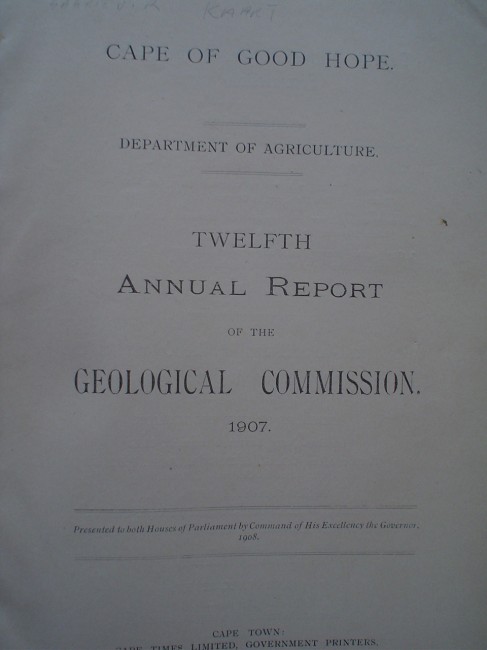 Twelfth Report content: Geological survey of parts of Vryburg, Kuruman,, Hay and Gordonia. Also surveys of part of Mafeking and Vryburg, Britstown and Hopetown.