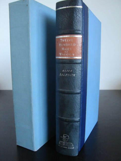 Binding quarter leather. Blue cloth-covered boards with top edge gilt. Tan leather band with silver titles on spine, colour frontispiece with tissue guard. Blue slipcase with gilt waggon design, slightly worn on edges. Overall condition Very Good.