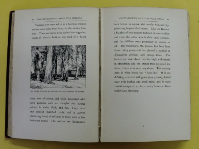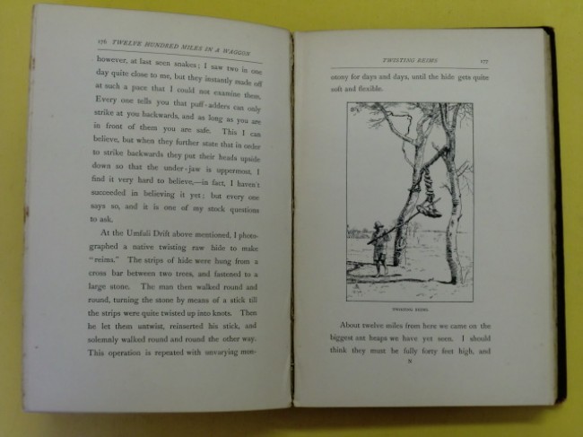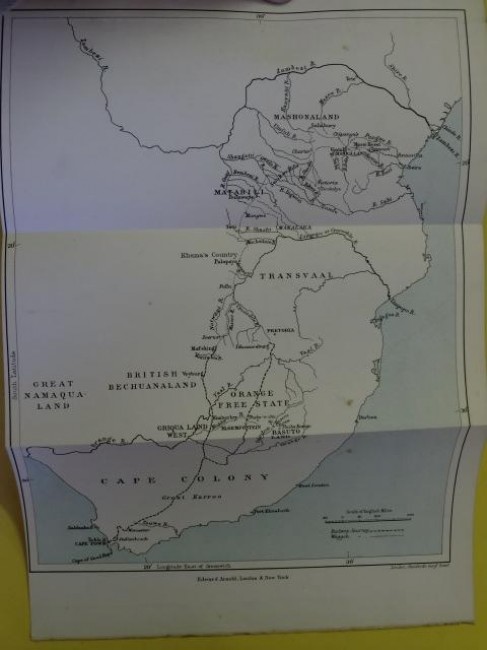First edition of the travel notes to the Cape from \'Matabililand and Mashunaland by waggon\', in 17 chapters, 265pp. line-drawn illustrations, and fold-out map and 32 page list of \'Books On African And Eastern Subjects\'. Condition: original red boards good, gilt illustration on front, gilt spine titles, dark green end-papers clean (both hinges cracked), end-papers foxed, fore-edge uncut, spine faded, head and foot slightly threadbare, corners bumped, marked and slightly scuffed; binding tender in places with some gatherings being loose, text is clean throughout.