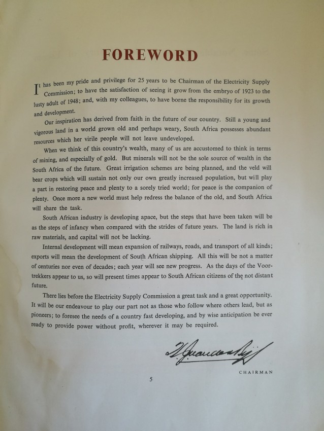 Loosely inserted is a reproduction of a cheque for fourteen million five hundred pounds paid by Escom for the entire shareholding of the Victoria Falls and Transvaal Power Company Ltd.