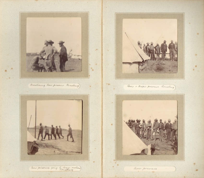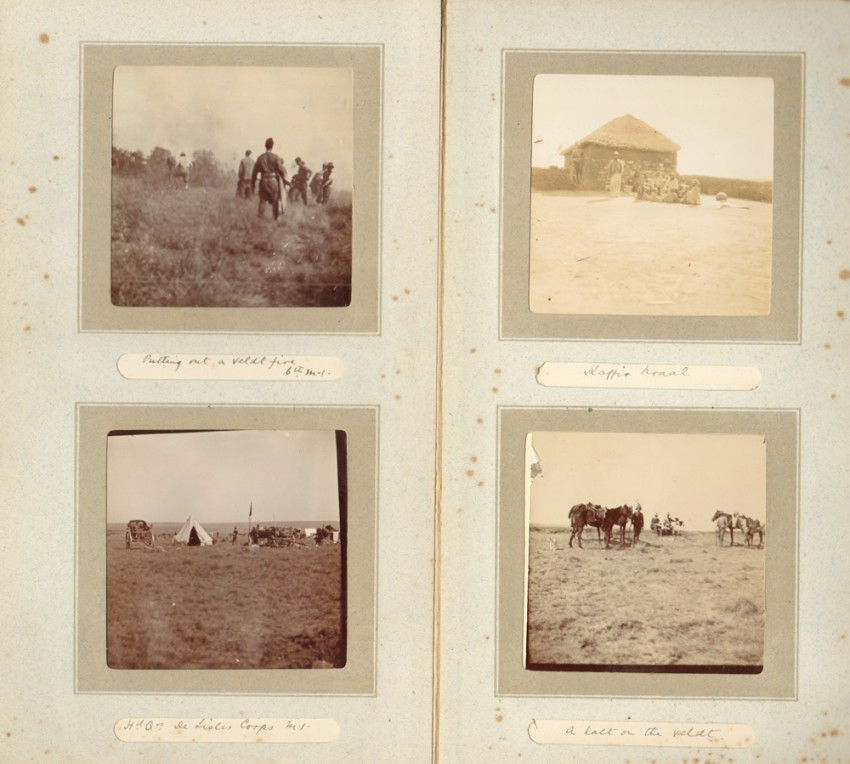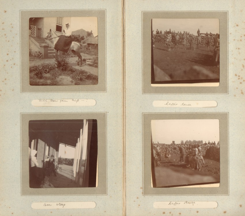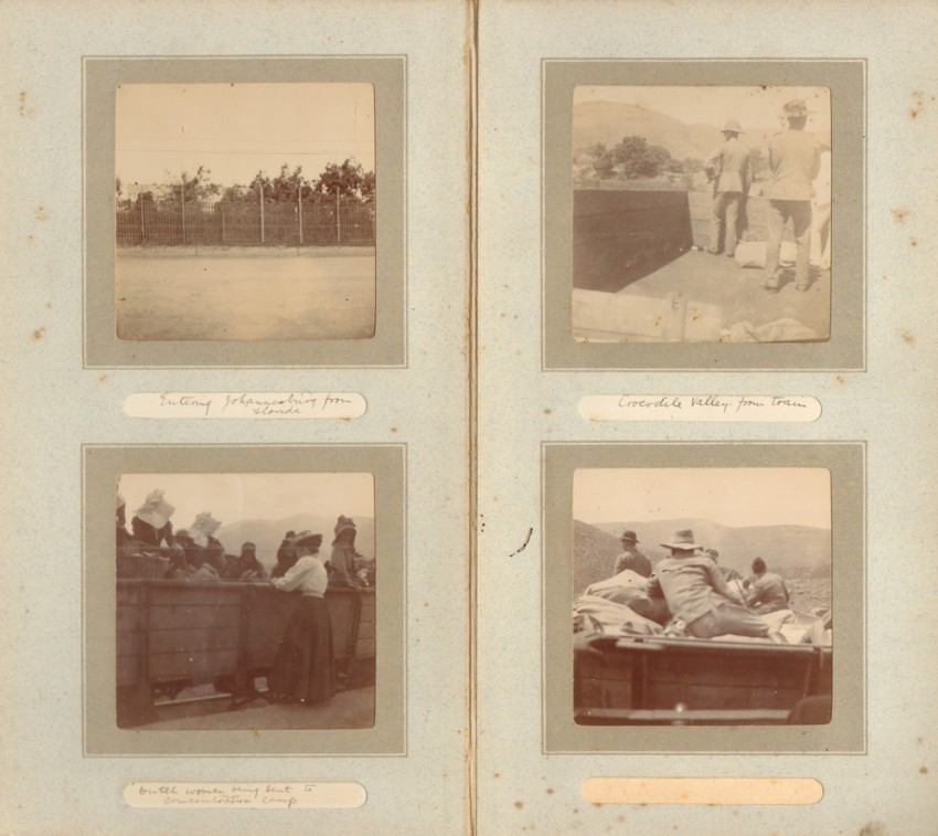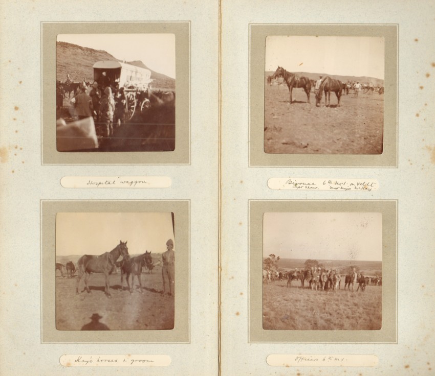 The photographs comprise the voyage and then activities on active service including questioning Boer prisoners, Boer and African prisoners being guarded together, guns on Coles Kop, debris of Cronje's wagons at Paardeberg, activities and action on the march to Johannesburg and Pretoria, activities on the way east to Machadodorp, Boer women being sent to a concentration camp, Crocodile Valley, camp a Bethlehem...