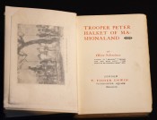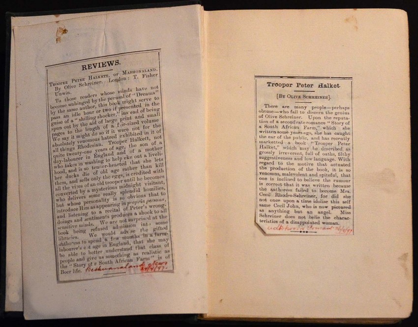 1. Trooper Peter Halket of Mashonaland. 1897. T. Fisher Unwin. In the original green cloth with gilt lettering on the spine. Top edge gilt and other edges uncut. With the notorious (and in my opinion not so scarce) hanging frontispiece. The cloth has slight wear and a few marks. Stickers have been removed (one partially) from both front endpapers. There is an ownership rubber stamp on the front free endpaper. Internally otherwise clean and unfoxed. What makes this copy interesting is the presence of two uncommon contemporary reviews (1897) tipped on to two preliminary blanks – one from the Bechuanaland News and one from the Oudtshoorn Courant.