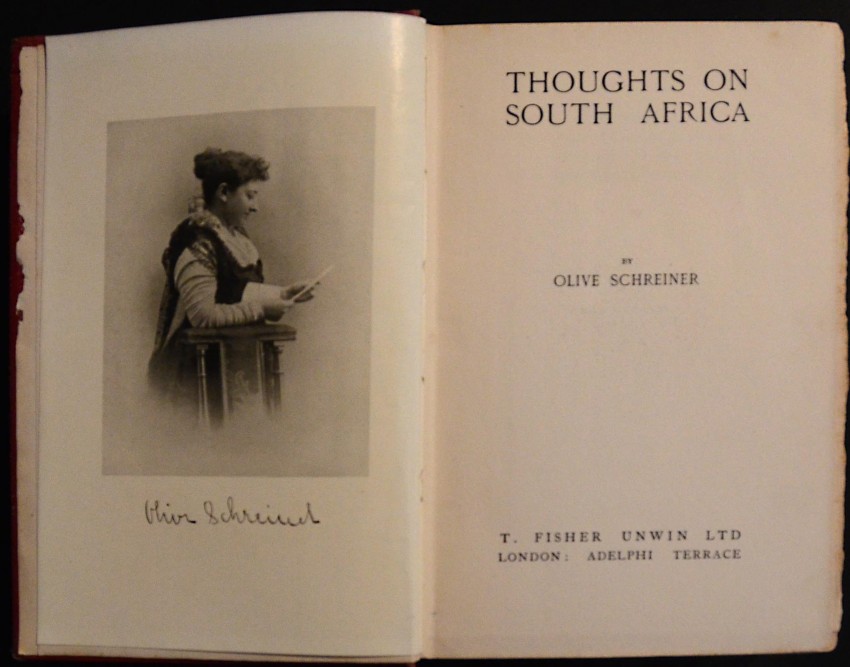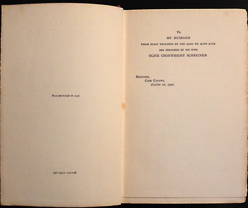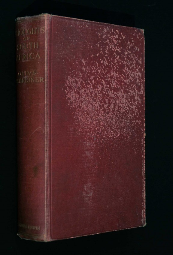 2. Thoughts on South Africa. 1923. T. Fisher Unwin. In the original red cloth with gilt lettering on the spine. The boards have some scarring (probably fishmothing) more marked on the upper board. There are two signatures on the front pastedown which also has some slight edge loss from fishmothing. The blank front free endpaper is missing. Internally otherwise very clean and unfoxed.