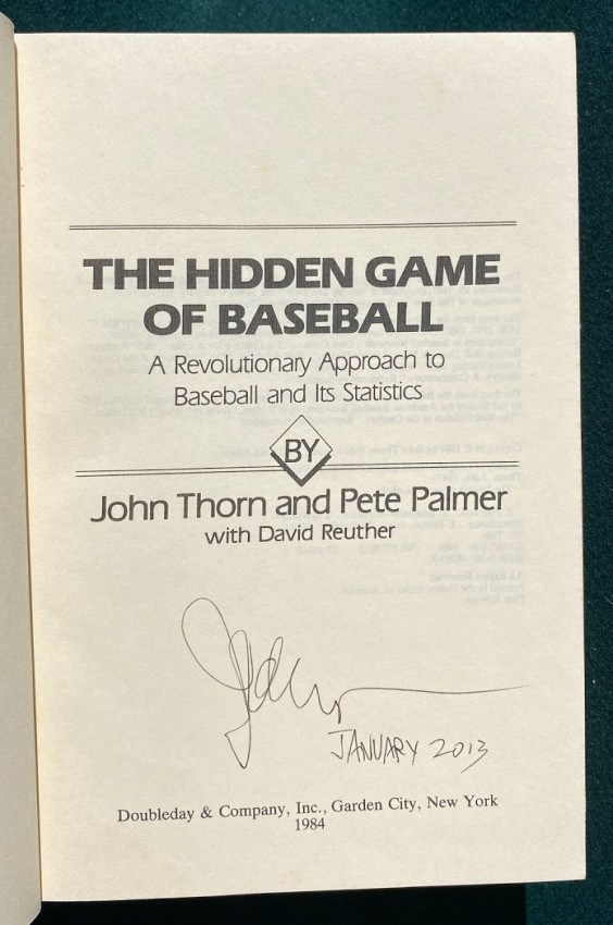 John THORN & Pete PALMER.The Hidden Game of Baseball. Garden City, N.Y.: Doubleday & Company, Inc., 1984. Octavo (9 x 6in; 228 x 153mm). Cloth-backed boards, dust-jacket. First edition, signed by Thorn o the title and dated 2013.