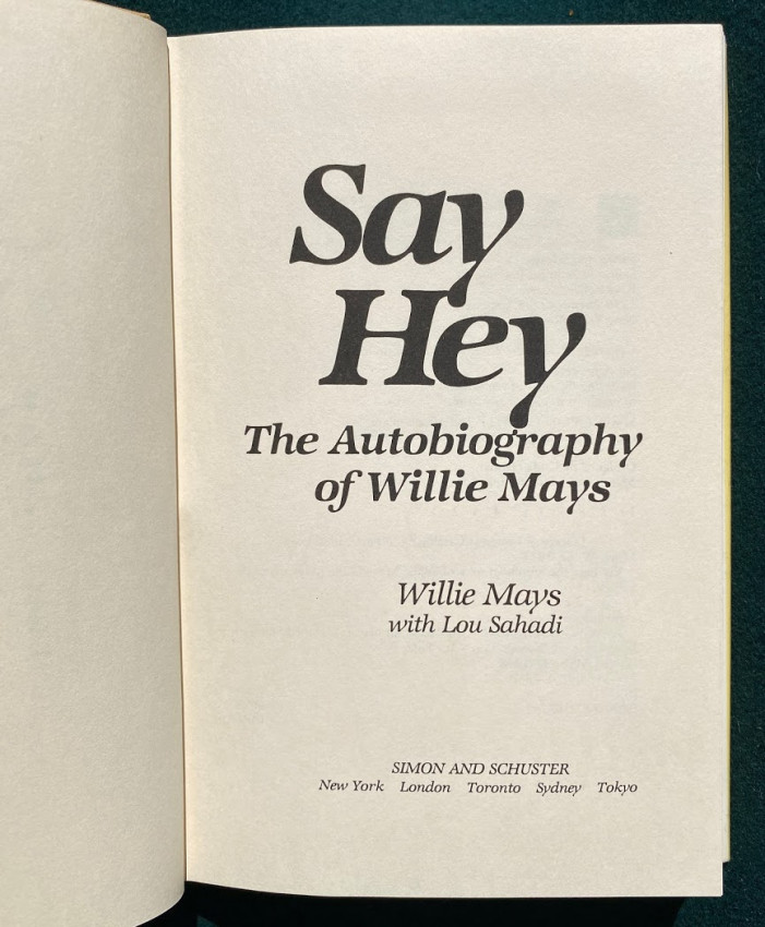 Willie MAYS & Lou SAHADI. Say Hey The Autobiography of Willie Mays. New York, London, [etc].: Simon & Schuster, 1988. Octavo (8 ½ x 5 1/2in; 216 x 140mm). Plates. Cloth-backed boards, dust-jacket. First edition, signed on the front free endpaper by Willie Mays.