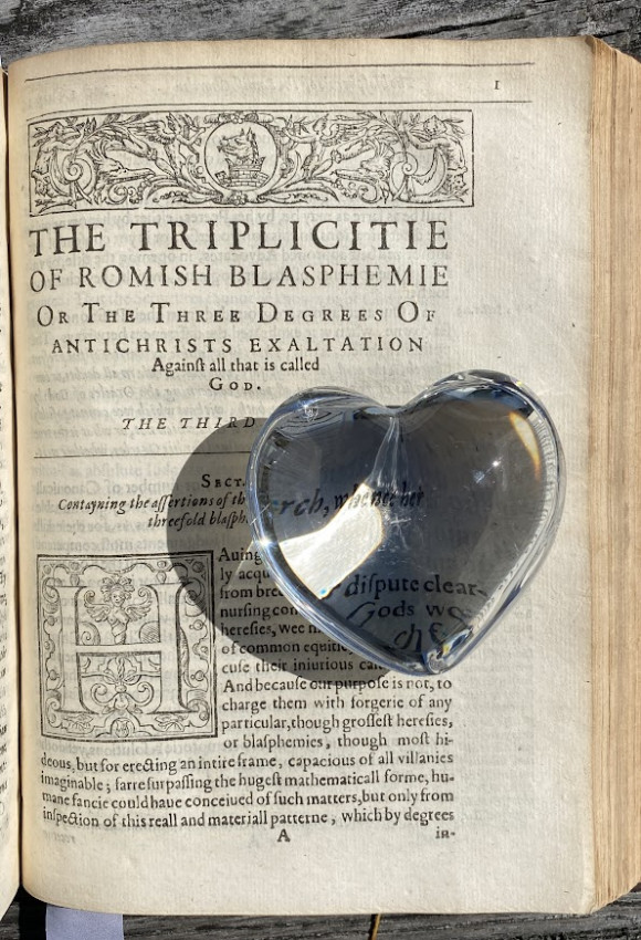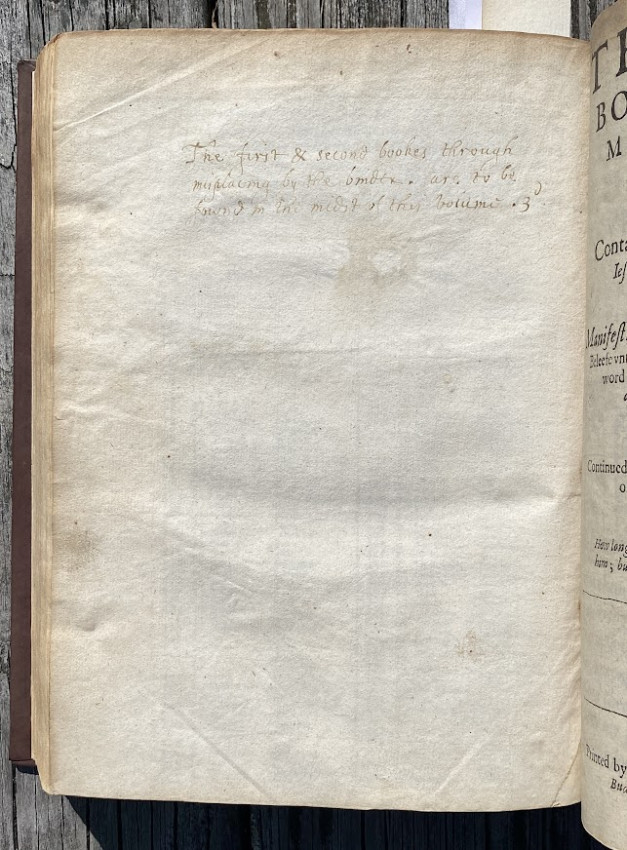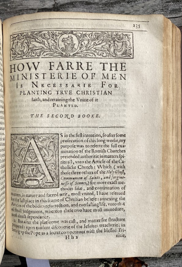 Thomas JACKSON (1579-1640). The Eternall Truth of Scriptures, and Christian Beleefe, … Delivered in two bookes of commentaries vpon the Apostles Creede. London: printed by W. Stansby and are to bee sold by Iohn Bridge, 1613. [ESTC S107449; STC 14308]; The Third Booke of Commentaries vpon the Apostles Creede, contayning the blasphemous positions of Iesuites and other later Romanists. London: by William Stansby, and are to be sold by Iohn Budge, 1614. ESTC S107489; STC 14315. Two works in three ‘books’ bound in one volume (as issued), small quarto (8 ½ x 6 ¼ inches; 216 x 159mm). Early blank bound between the two volumes. (F3 in the second work re-inserted but with damage to the upper and outer margins [no loss of text], old wormtrack to inner blank margin of L1-P4 in the second work, some light old soiling to title of the second work [see images]). Moderrn calf by Starr Bookworks, tooled in blind, lettered in gilt. Provenance: J.D. (inscription to title of second work, signed with initials).