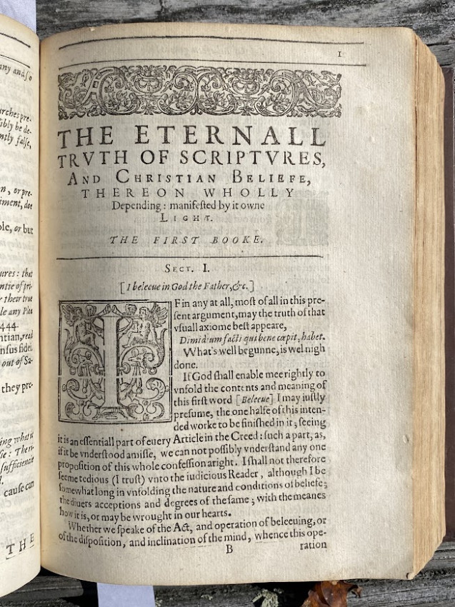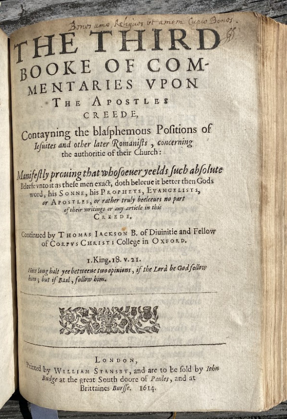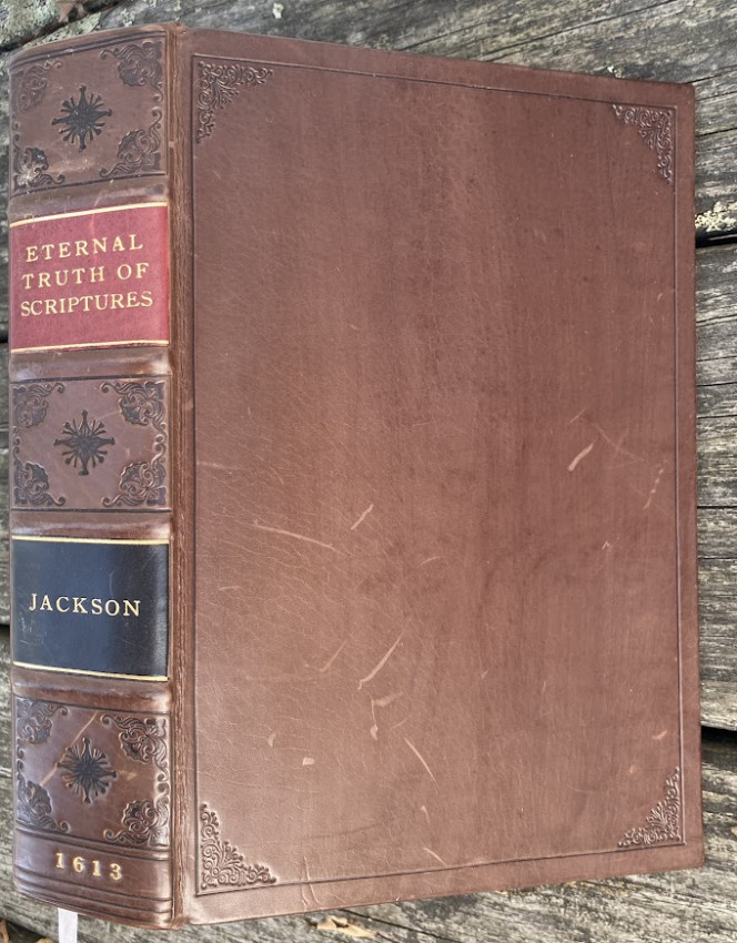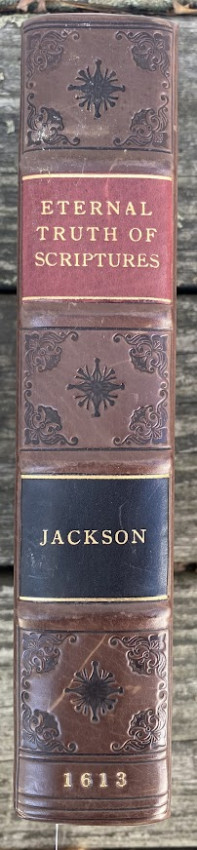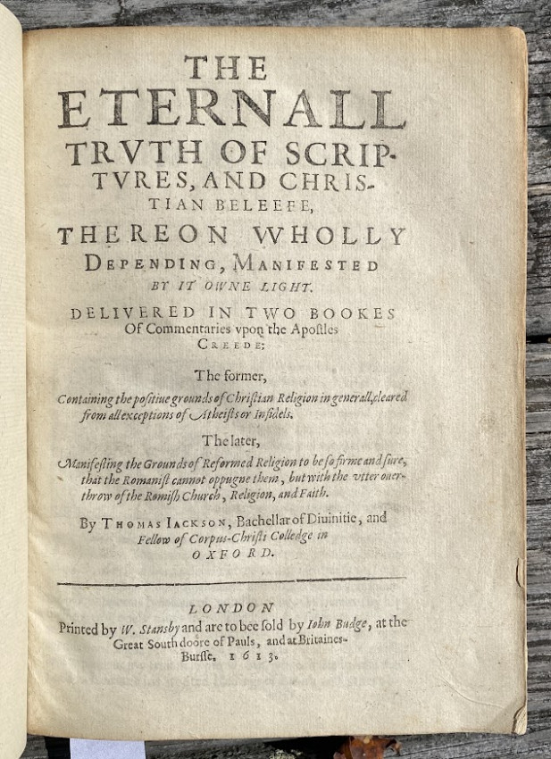 "His chief work was a series of commentaries on the Apostles' Creed, the first complete edition being entitled The Works of Thomas Jackson, D.D. (London, 1673), edited by Barnabas Oley. The commentaries were originally published in 1613 to 1657, as twelve books with different titles, the first being The Eternal Truth of Scriptures (London, 1613)." (wikipedia).