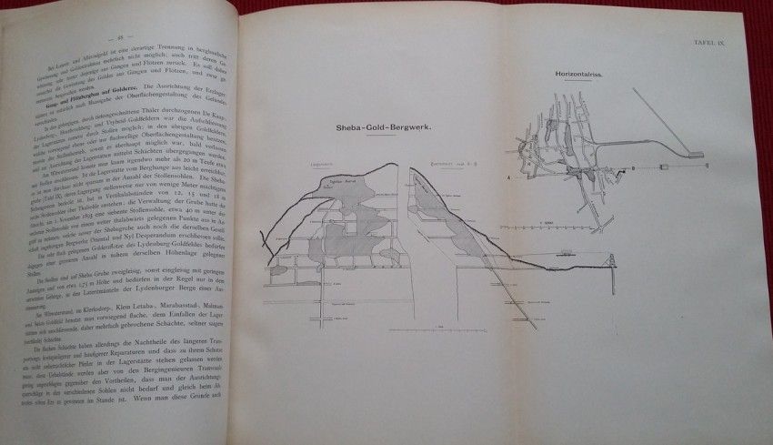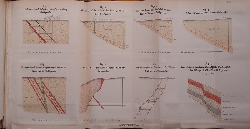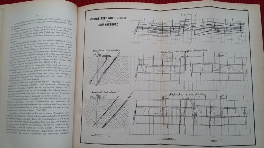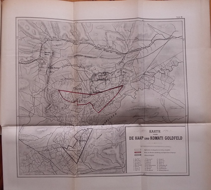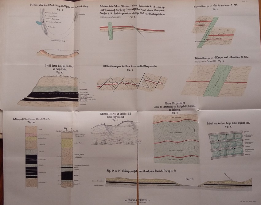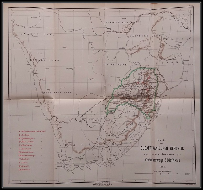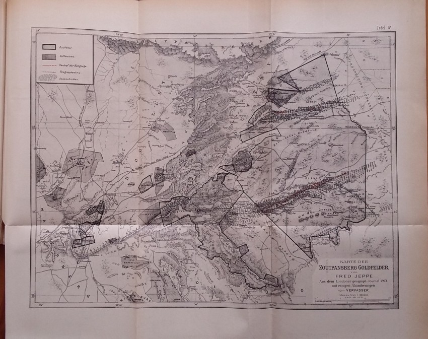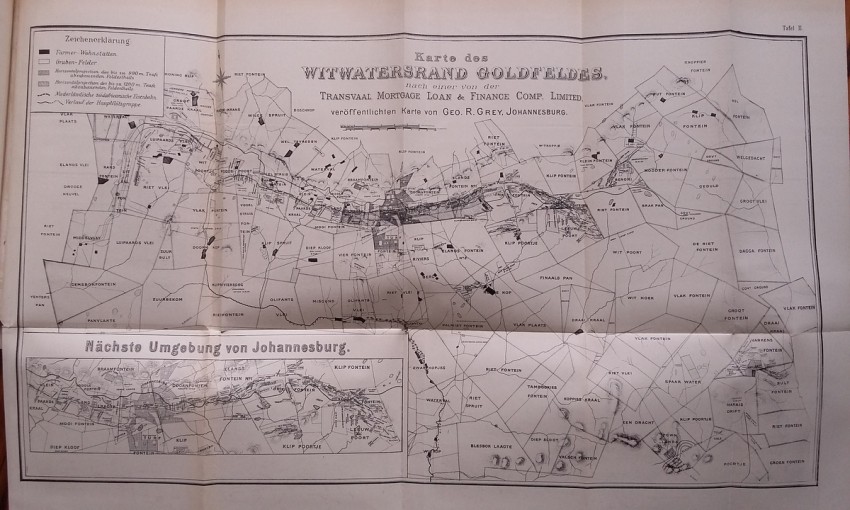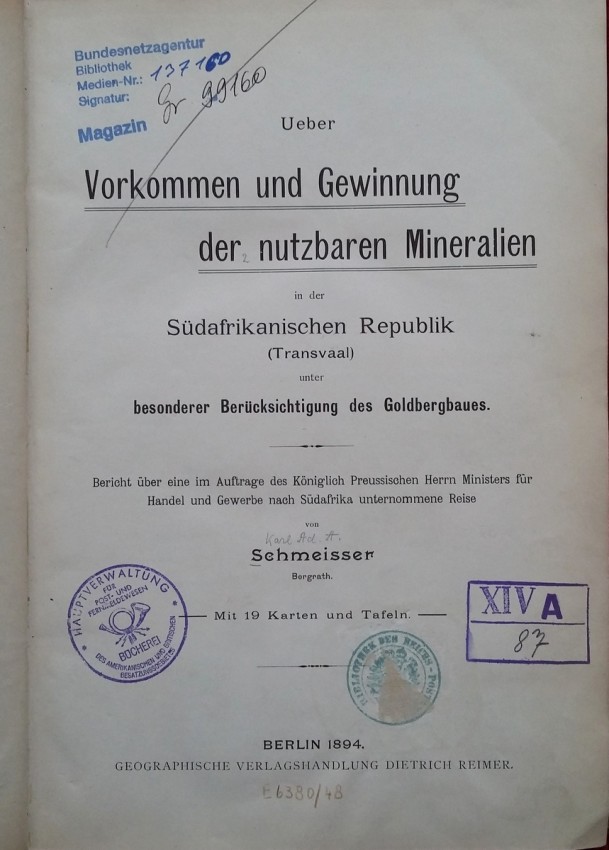 "Ueber Vorkommen und Gewinnung der nutzbaren Mineralien in der Südafrikanischen Republik (Transvaal) unter besonderer Berücksichtigung des Goldbergbaues. Bericht über eine im Auftrage des Königlich Preussischen Herrn Ministers für Handel und Gewerbe nach Südafrika unternommene Reise"; Collation complete - VII, 151 pages, with 19 folding maps and tables, some large format, partly colored; Text in German; Binding is tight and firm, but scuffed and worn. Title page with ex-libris stamps. Text block/pages very bright and clean, overal in very good condition.