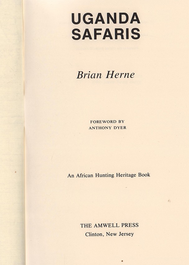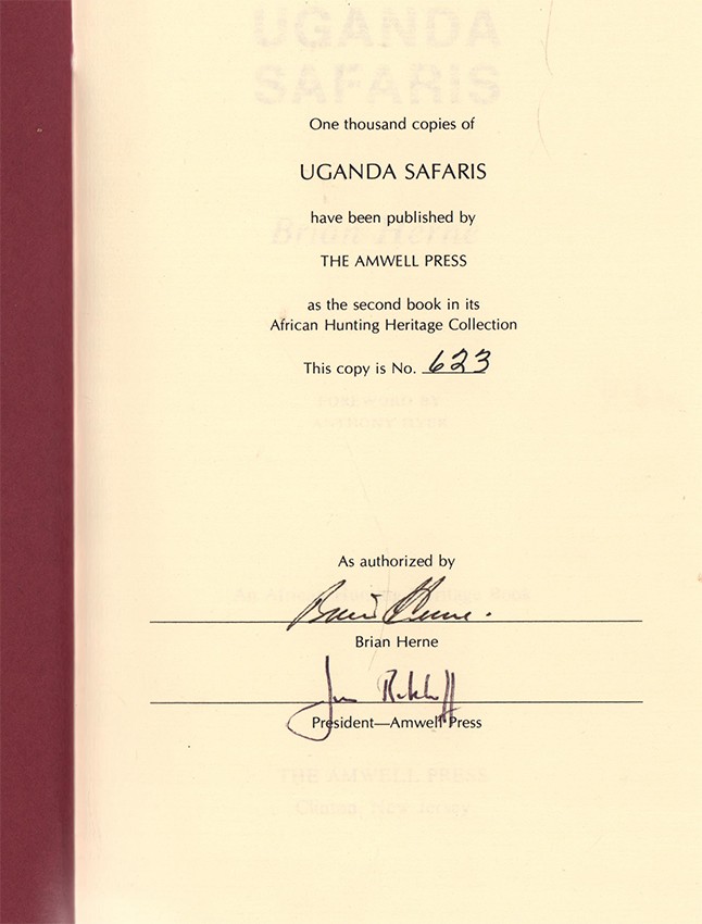 Limitations page reads: One thousand copies have been published as the second book in its African Hunting Heritage Collection. This is copy no.623 signed by the author and the president of Amwell Press.