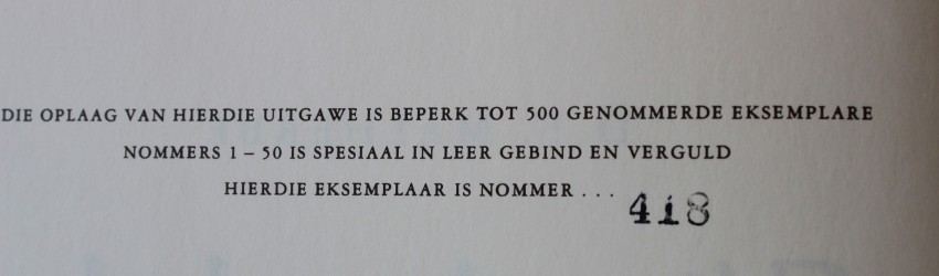Faksimilee van die oorspronklie ongepubliseerde manuskrip. Met inleiding deur O.J. Liebenberg. Die oplaag van hierdie spesiale uitgawe is beperk tot 500 genommerde eksemplare. Hierdie eksemplaar is nommer 418.