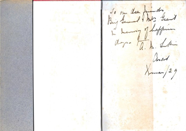Signed & dated (Xmas /29) inscription "in memory of happier days" from A. Lukin to Brigadier-General Ronald Charles Grant and his wife.