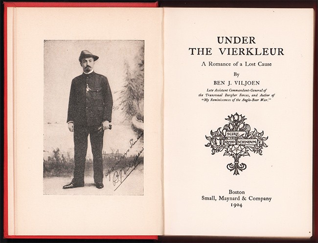 Mendelssohn (Sidney) SOUTH AFRICAN BIBLIOGRAPHY volume 2 page 568 -569 :In humorously alluding to the fabulous tales about him which had appeared in the British papers, the General remarks that " after the several coups de grace in the field, and the tragic execution at De Aar all which is left of Ben Viljoen still pans out at a fairly robust young fellow quite an ordinary young fellow indeed, thirty-four years of age, of middle height and build," although a periodical narrated how, bound to a chair, and placed near his open grave, he had met his doom with " rare stoicism and fortitude." The work is free from bitterness, and is characterised by a fairness and lack of bragging which favourably distinguishes it from other publications written from the Boer point of view, while the humour, candour, and good-nature displayed in the volume are undeniable. The author was instructed by General Joubert to proceed to the Natal frontier, and he subsequently joined the troops under General Kock's command. He does not appear to have had a high opinion of his leader, and remarks, possibly if we " had had less to do with arrogant and stupid old men, we should have reached Cape Town or Durban." From time to time he expresses his discontent with most of the Boer Generals of the old school, and he was extremely impatient of their super-caution, credulity, and superstition, which brought him on several occasions to the verge of insubordination, whilst at times he considered that he had been slighted by Joubert, who appears to have been dubious as to the courage of the leader and his Johannesburg men. Viljoen is far more honest as to the Boer losses than other writers on the Boer side, and makes no secret of the fact that large numbers of the Burghers had British proclivities, especially at the end of the war, although he is very bitter about the " handsuppers," some of whom contrary to the general opinion were women. These people were regarded by the General as traitors, and there is an account of the " execution " of Meyer De Kock who came to Viljoen's camp to induce his men to surrender, and who, it is stated, was the first man who first suggested to the British authorities the establishment of concentration camps. The Boer General defends the blowing up of trains, which he considered quite as justifiable as the burning of houses, and was, he asserts, no doubt as distasteful to him as the latter was to Lord Kitchener. Viljoen was captured by Major Orr, after an engagement in which two of his adjutants were killed. According to " After Pretoria " (by H. W. Wilson), the Boer leader was tried by a British Court Martial on the charge of breaking the laws of war, but he was acquitted: nothing of this, however, is mentioned in this volume. He was sent to St. Helena on February 19th, and speaks with some dissatisfaction of his treatment on the island.
