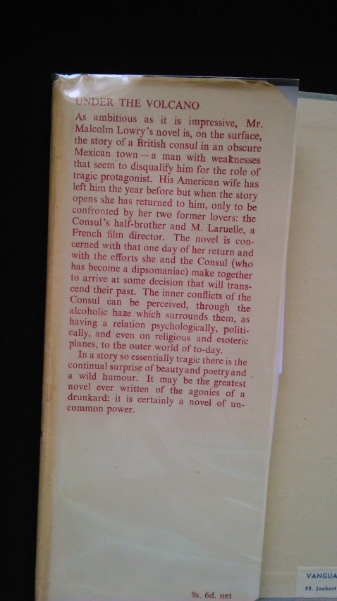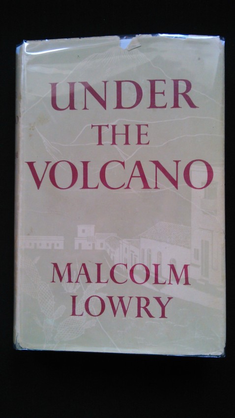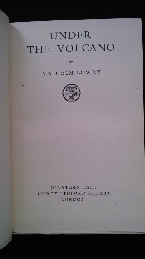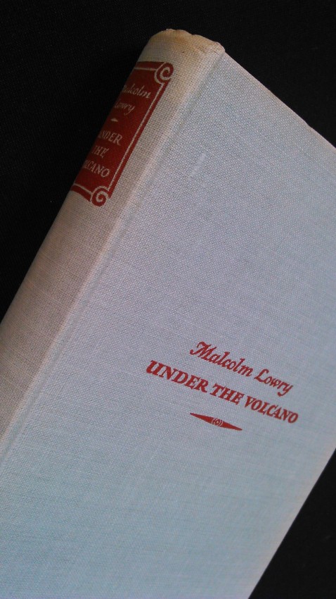 Previous owner’s inscription on the top/front end paper. A partially autobiographical novel revolving around drinking binge on the Day of the Dead in Mexico, voted number 11 on the Modern Library Best 100 novels list.