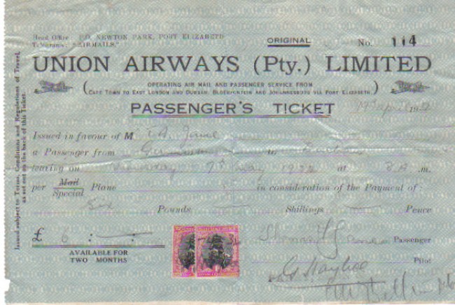 ORIGINAL TICKET ( no.114 ),19.4.1932.issued for a passenger (named) from Germiston to Durban for 6 pounds ,with duty stamps