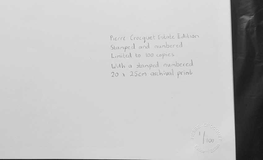 This is a Pierre Crocquet Estate Edition. The Estate Edition comprises 100 copies of the first edition which were found in storage after the photographer's death. The book is accompanied by a limited edition archival print. Each copy is stamped with the Estate embossing stamp and this is number 1/100. The book was signed by Pierre Crocquet in 2002 on publication.
