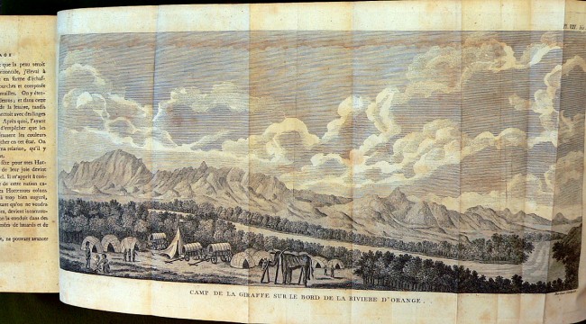 Mendelssohn, I, 892, 889, 890: His description is unique for this period, as little information respecting these regions had been published up to this date\'. Mendelssohn claims the first edition was in 1796, An 4 of the republic, which was issued with a map, not issued in this earlier edition. The second expedition was to Namaqualand, Damaraland, Bechcuanaland and the Kalahari Desert. It provides an interesting and early narrative of South Africa at a time when it was little known. The plates, including of giraffe and of hippopotamus, which were little known then, the local people, and several views . His many references to birds and animals became useful primary sources for many later works by other authors. A classic work on African travel.