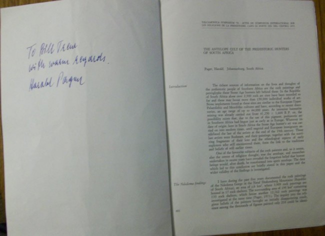 Pages 401-411 bound as paper presented and delivered by Harald Pager- The Antelope Cult of the Prehistoric Hunters of South Africa. Text and Line Drawings.