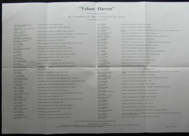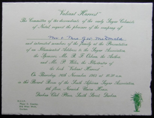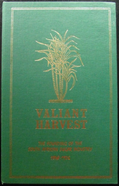 "Presentation copy additional to the first one hundred to G.W.McDonald, Esq. #116" signed by author below presentation plate. Includes EPHEMERA: (i) Original invitation to 'an illuminated address to the Sugar Association, the Sponsors, Mr R F Osborn, the author and Mr P Wiles, the illustrator of the book Valiant Harvest" (ii) a loosely inserted A3 size chart being 'Key to the signatories to the Address to The South African Sugar Association' 1-2cm of the paperblock fore-edge is water stained producing light rippling of the pages, this does not overly detract from the appearnce of the book. Map illustrated eps. Pages xii + 343 including index, with statistical charts and foldout iluustrations and charts.