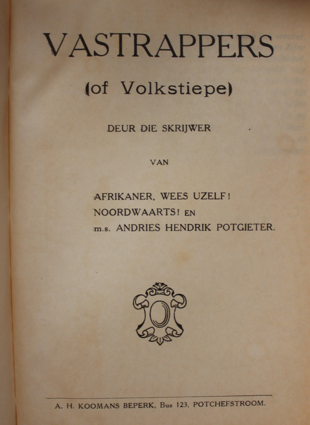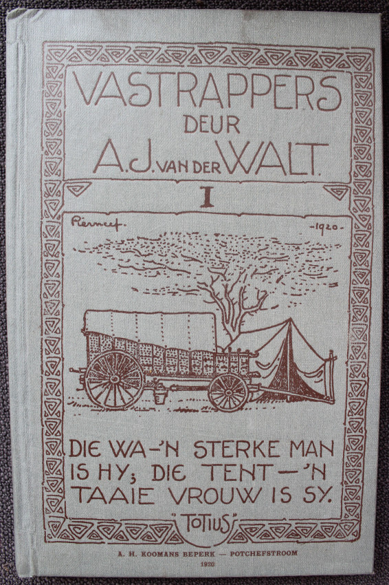 Skets van Pierneef voorop. En 'n frase deur Totius: Die wa - 'n sterke man is hy; die tent, 'n taaie vrou is hy. Uitgegee deur Koomans Beperk te Potchefstroom.