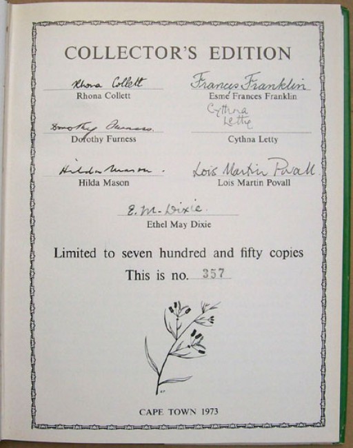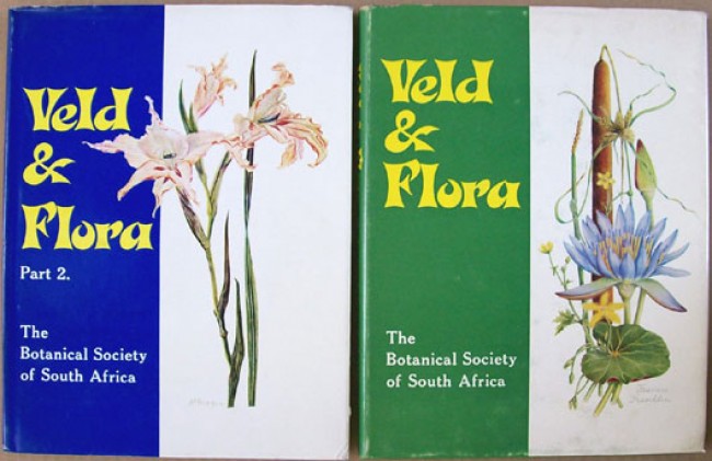 Both volumes are limited to 750 copies and are bound in book form with cloth boards and gilt titling on the spines. Both volumes have their original dust jackets. The volume dated 1973 is copy number 357 and the limitation statement is signed by Rhona Collett, Dorothy Furness, Hilda Mason, Esme Francis Franklin, Cythna Letty, Lois Martin Povall and Ethel May Dixie, who contributed colour plates. It has 14 prelims and 76 pages in vol 1 and the pagination goes to page 80 in vol 2 - both being bound in one volume. The volume dated 1975 has 10 prelims, 80 pages in the first part, volume3, and 80 pages in the second part, vol. 4 and a total of 8 colour plates. The limitation page is signed by the artists, such as Auriol Batten, Fay Anderson, Stanley Charles Seagrief, Marjorie Willie, Elise Buitendach. Together, these 2 books contain volumes 1 to 4. Both volumes are profusely illustrated with black and white figures, drawings, maps, etc. For those who want a collection of the signatures of some of the finest botanical artists working in southern Africa, this lot is a good buy.