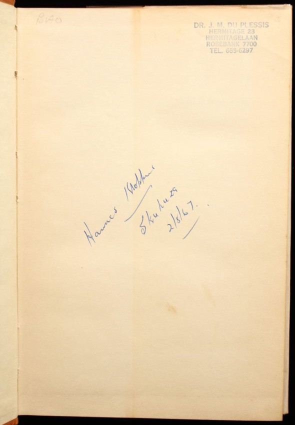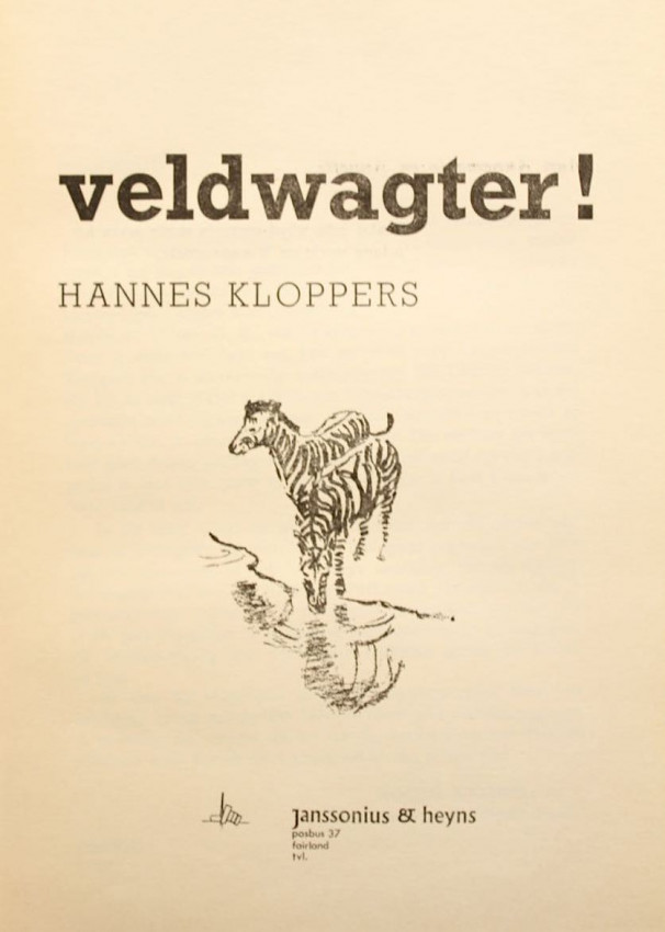 Signed by the author on front endpaper, "Hannes Kloppers, Skukuza, 2/8/67."