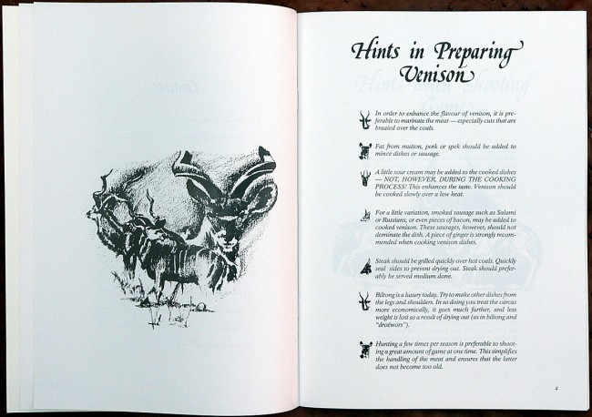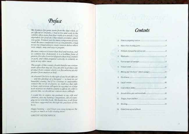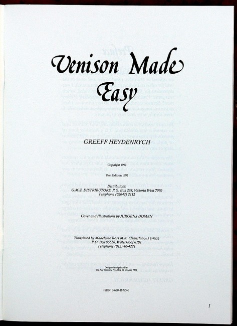 Contents include; Hints in preparing venison; Hints when shooting game; Methods of preparing various cuts; Marinades; Various types of sausages; Venison steak; Biltong and Droewors; Diced meat; Leg of venison; Cold venison dishes; Stewed dishes, pies and meat balls; Tongue, heart and liver; Smoking.