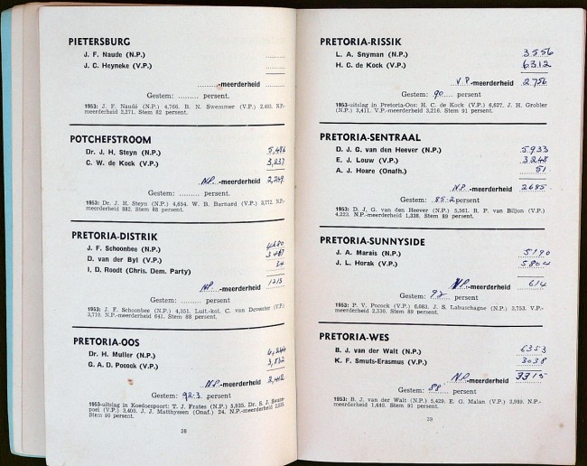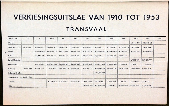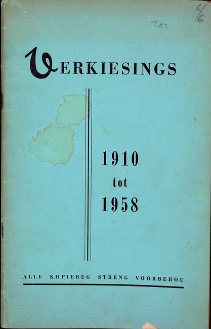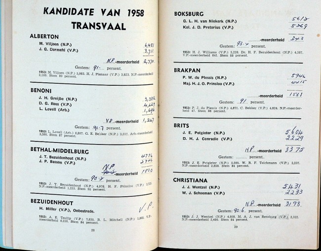 An alphabetical list of all the voting districts of 1958 with hand-written results and the corresponding winning party of each district. Also a full list of results from 1910 to 1958. The state of parties after general elections. The state of parties as at 11 March 1958. Candidates of 1958.