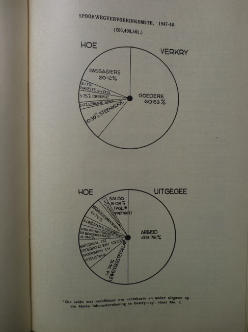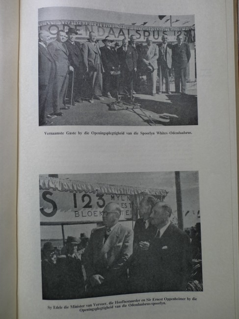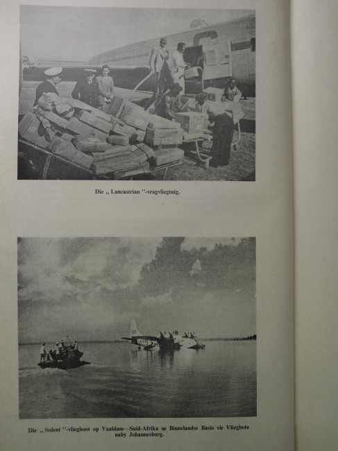 Photographs include the opening of new line between Bloemfontein and Odendaalsrus, Lancastrian (freight) and Solent (passenger) aircraft, additional platforms at Johannesburg station, the Salt River locomotive assembly works, electrified track passing the 1200-mile mark, the introduction of a second luxury airconditioned long-distance passenger train ("Oranje" after the Blue Train), Brandfort Station (winner of the 1947 Lady Duncan trophy for the country's best-kept station), passenger and freight road motor services and coal and refrigerated rail services.