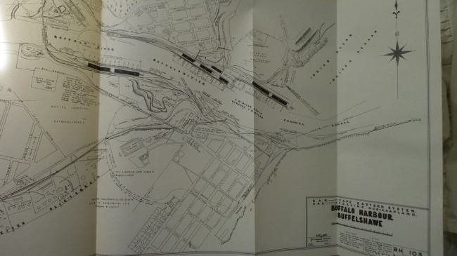 The high-quality heavy red simulated leather-boards, gilt-embossed to the upper panel, are still in fine condition, as are the unmarked plain endpapers, binding and x + 191 pp of index, text illustrated with photographs, tables and graphics + 2 blue card dividers separating the report, appendixes and plans and map. The inserts - with no tears and also fine are 6 b/w folding plans of Table Bay, Mossel Bay, Port Elizabeth, Buffalo (East London), Durban and Walvis Bay harbours and, at the back, a large b/w map of the country's railway network.