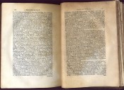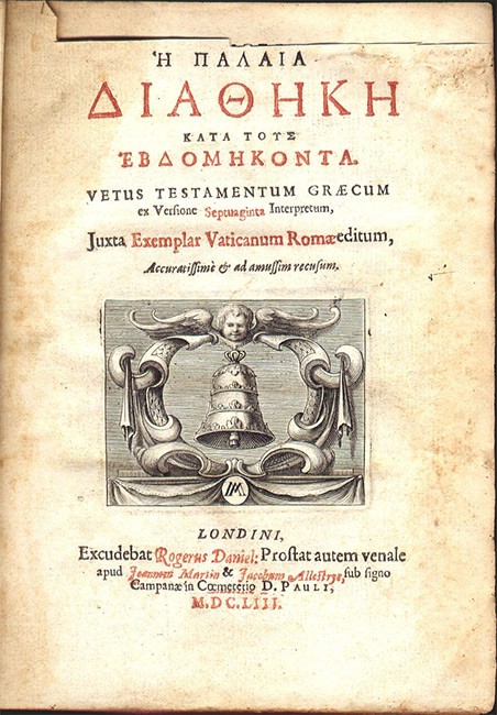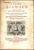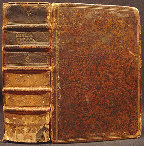 1p., Praefatio ad Lectorem - 4 pp., list of books - 1p., Text in double columns, 1279 pages, 1p. blank. Appendix: title In Sacra Biblia Graca ex Variantes, on verso Syllabus abbreviatoinum; Scholia etx., 186p.: 1p. bearing note Lectori, ip. blank. (+3 blanks).' Tightback bound in old full mottled calf, very worn, bottom half of the spine eroded away, corners worn, front hinge split and holding weakly on the ties, lower hinge split, extensive notes in an old hand in French on the front and rear free endpapers and blanks, with an oval bookplate of Peter Gunning D.D., Farmborough, staining of the text which is quite extensive towards the end. First edition of the LXX. printed in England. Possibly a reprint of the Sixtine text, with the scholia and variants. Edited by John Biddle (1615 - 1662), the Unitarian controversialist, who was imprisoned by the Parliamentary Commissioners for his religious views. (from D. & M. no. 4692)