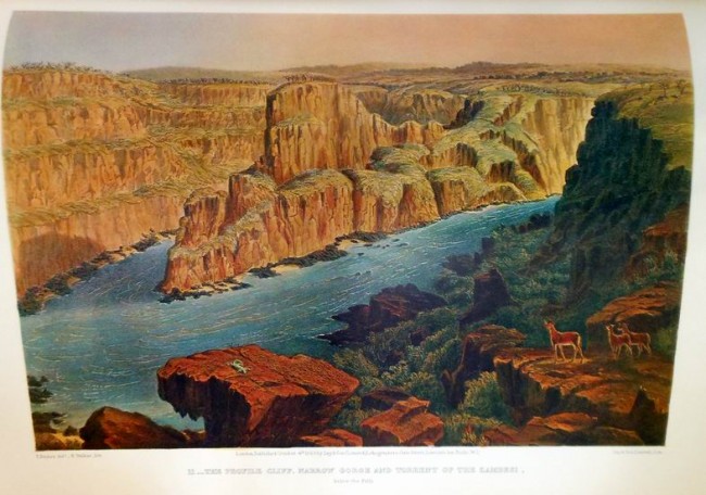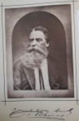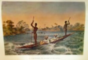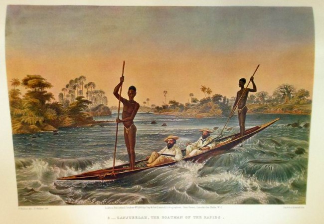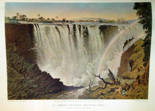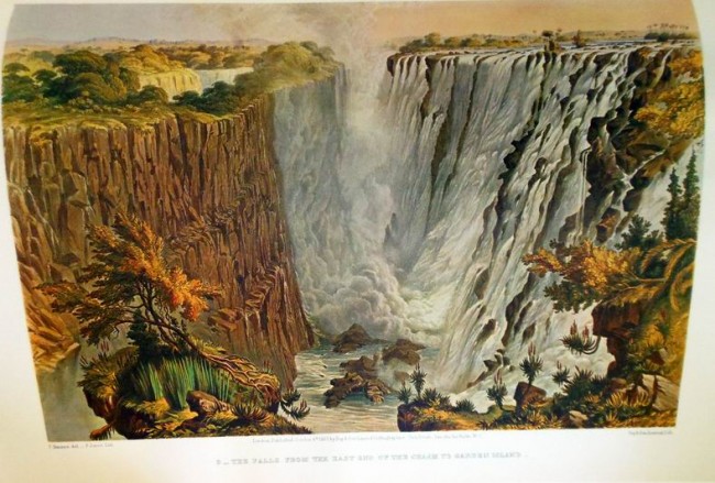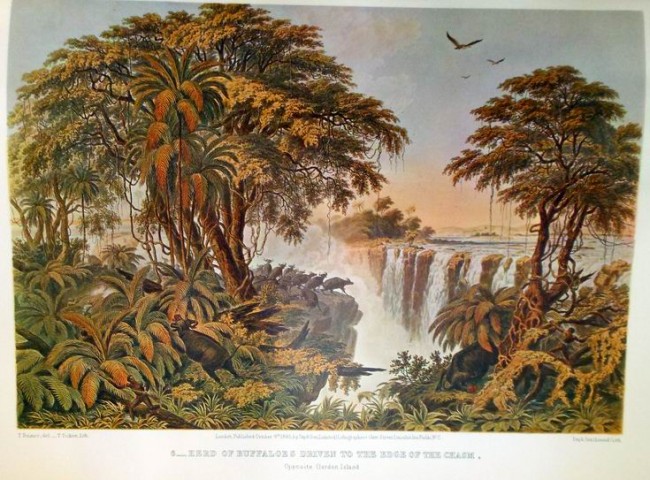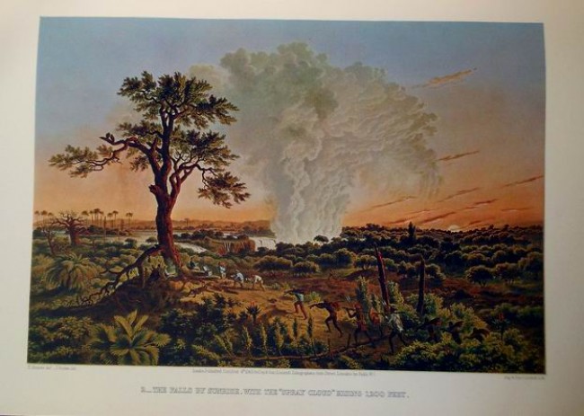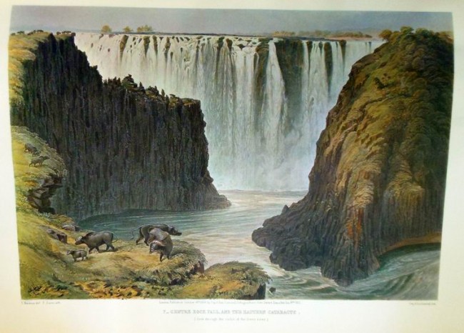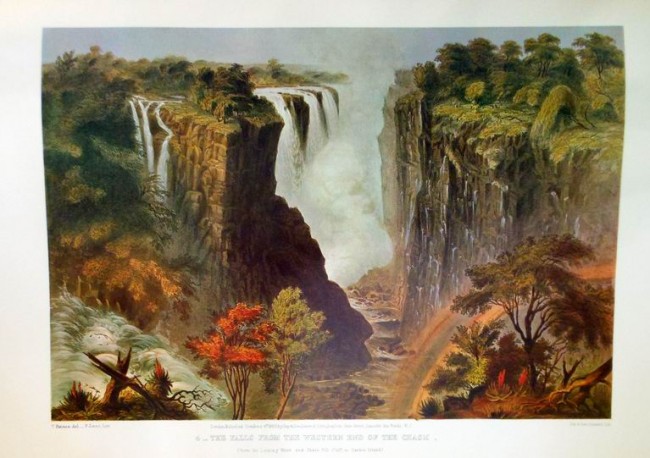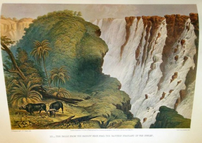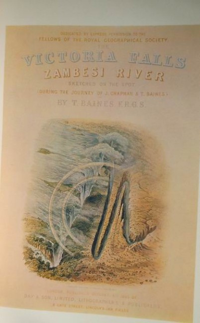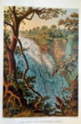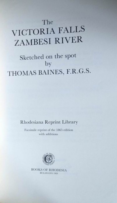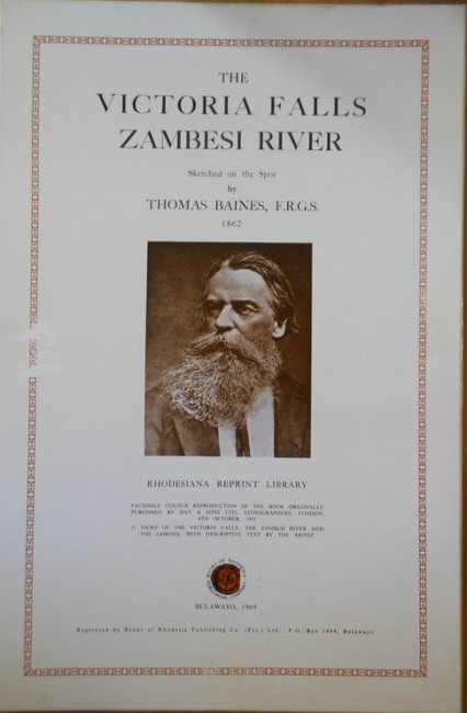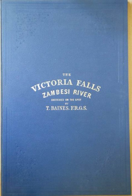 A large format "Atlas" (375mmX572mm) sized, hardcover book in a dark blue imitation leather binding with bright gilt titles and blind stamped corner decorations on both front and back covers, in very good condition. Cased in the original publisher’s cardboard box with black titles and a sepia photographic portrait of Baines, within an orange-brown decorative edge, on the lid. Ten preliminary and 8 pages of text. Tissue guarded sepia photographic frontispiece showing Thomas Baines plus 11 tissue guarded colour plates, facsimiles of the original chromolithographs, including a facsimile of the original coloured title page.