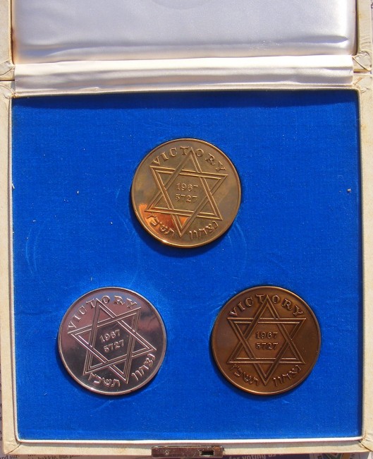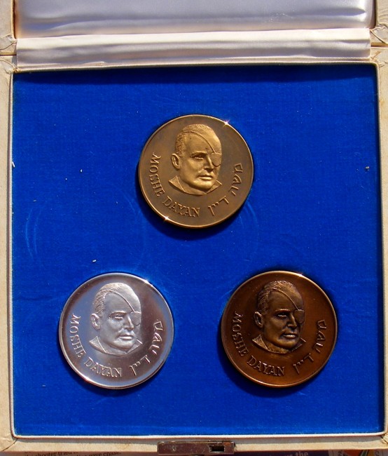 Set of 3 medallions in presentation case. The obverse features Moshe Dayan, the reverse The Star of David , the year ( in the western and jewish calendars). Medallions are 53mm in diameter and 3 mm thickness, presentation case is 190 x 190 x 28mm, condition Very good.