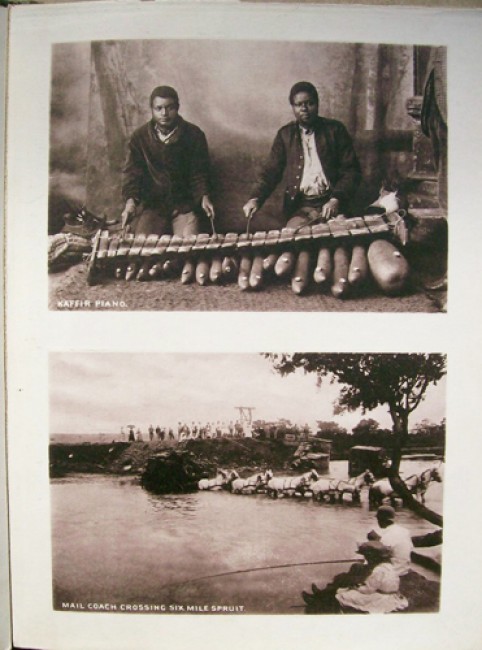 Original dark green cloth boards with gilt itling and a blind stamped decoraive border on the upper board. The contents consist of a fold out portfolio of black and white photographic illustrations, each with a caption in the picture, in white.