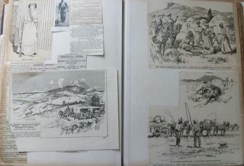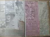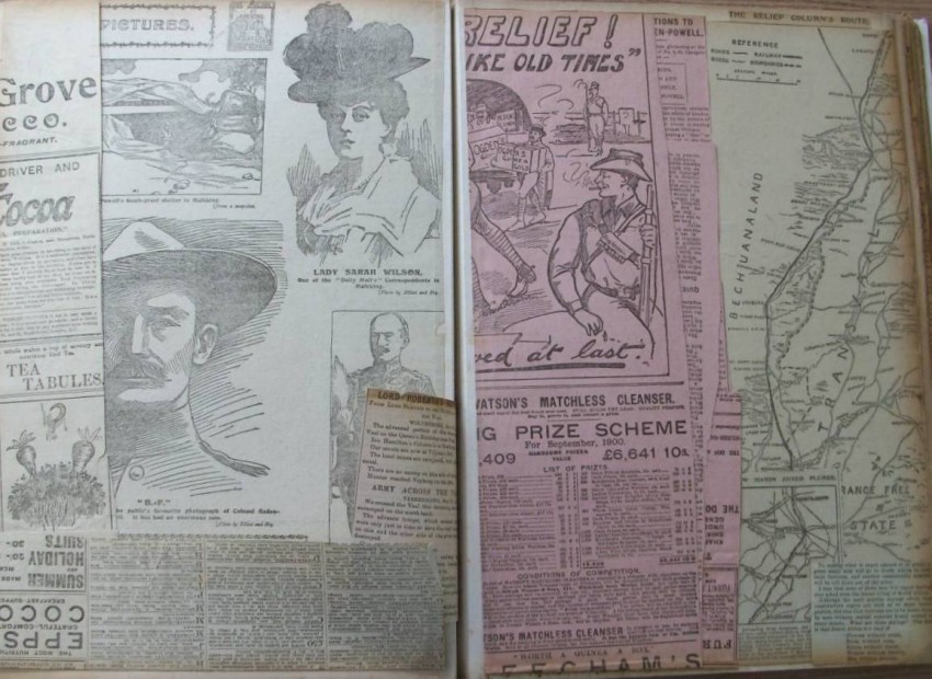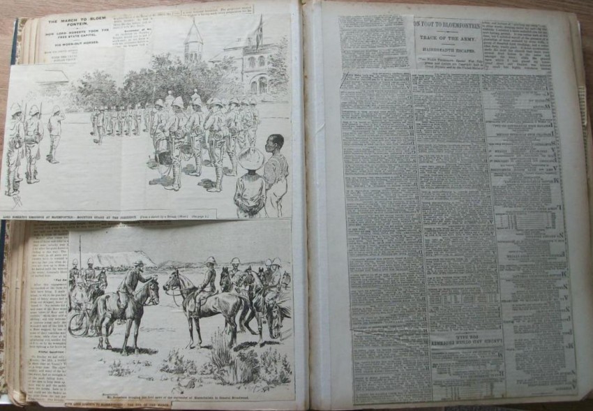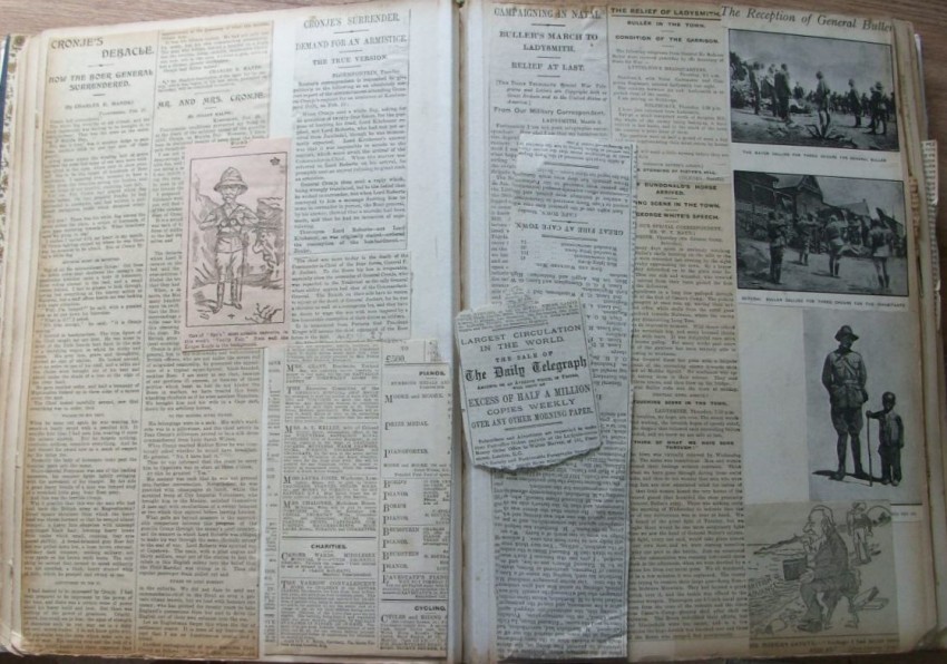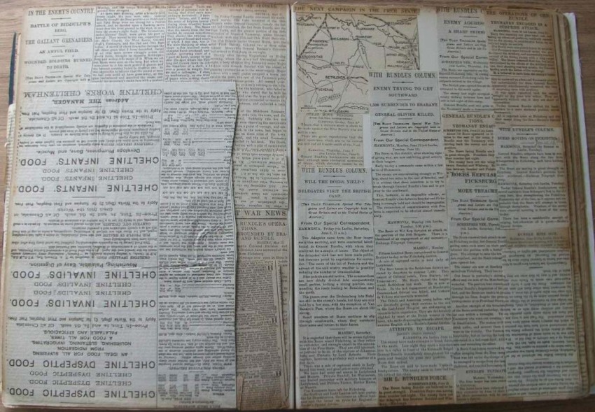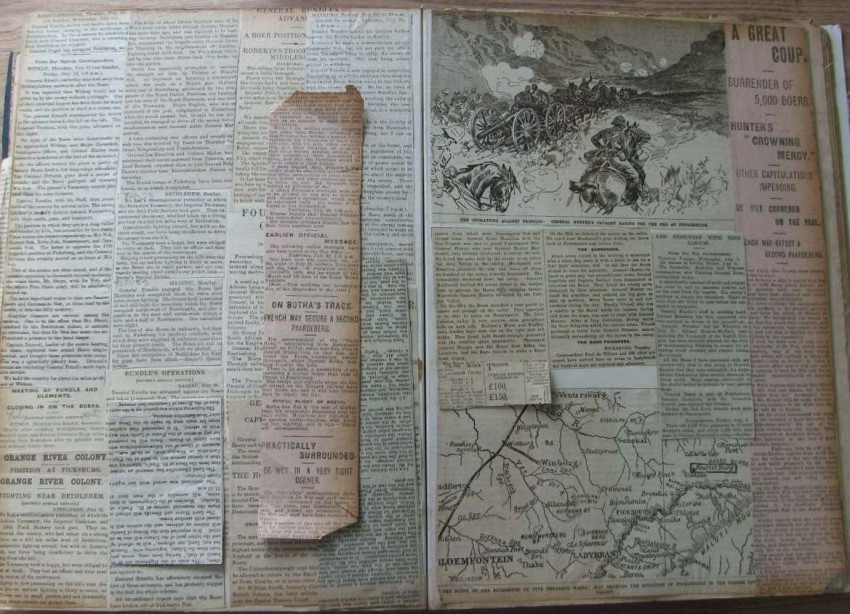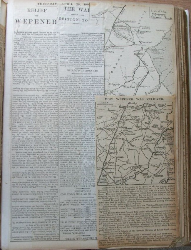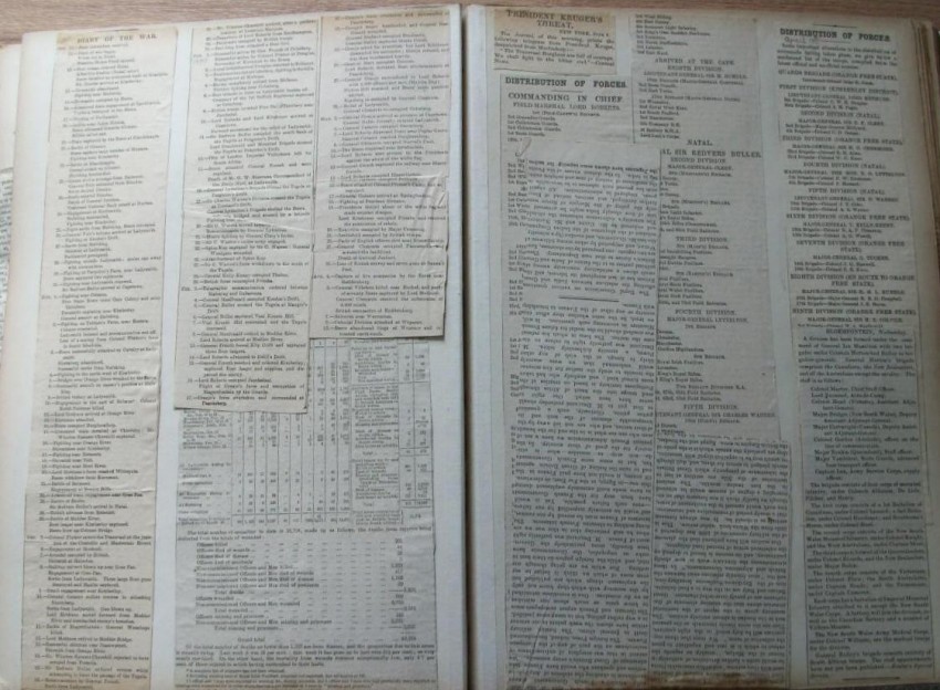 Original card cover, only a part of front cover inside. A new cover has been made to hold the 58 pages, which are crammed with news cuttings, commentaries, maps, images and data and information.