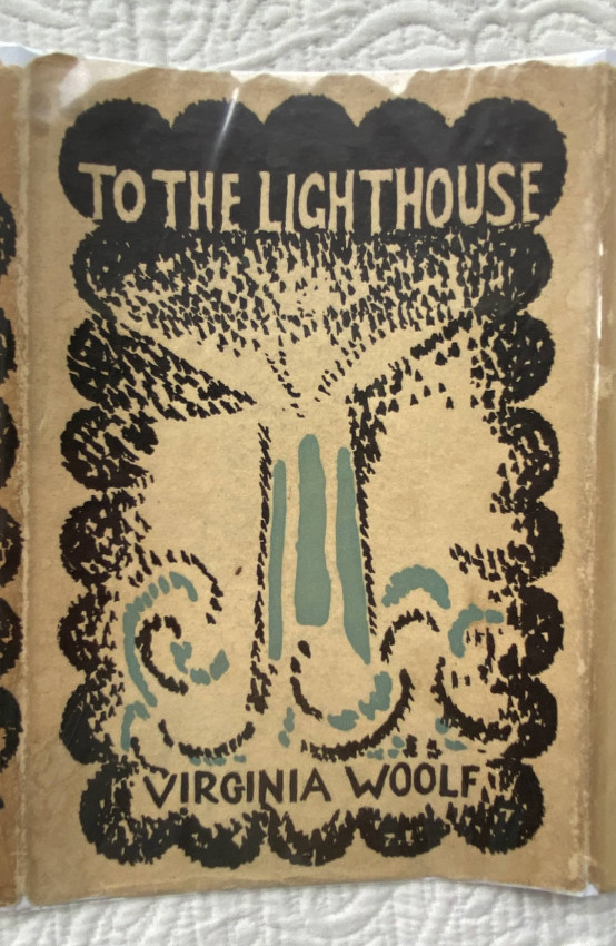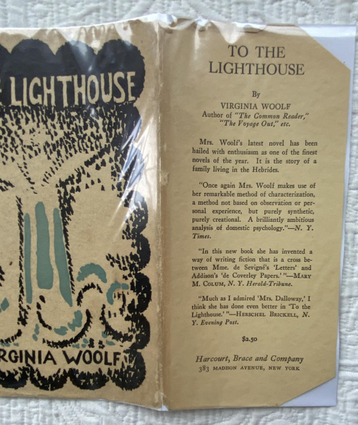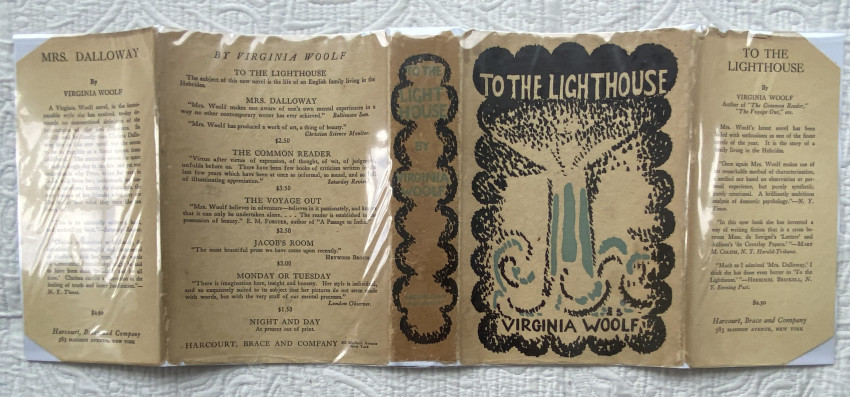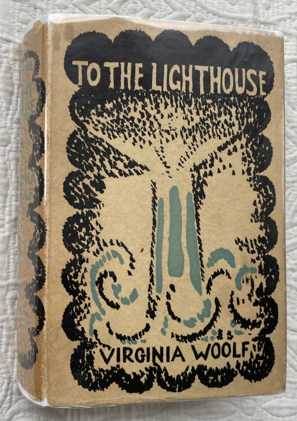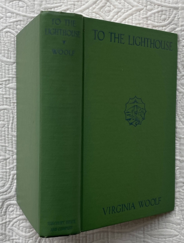 Virginia WOOLF (1882-1941). To the Lighthouse. New York: Harcourt, Brace & Company, [July 1927]. Octavo (7 ½ x 5 1/8 inches; 190 x 130 mm). Pp. [1-]9-310[-312]. Half-title. Light green cloth, blue lettering to upper cover and spine, original pictorial wrapper designed by Vanessa Bell (light soiling and chipping, corners of flaps cut [see images]).