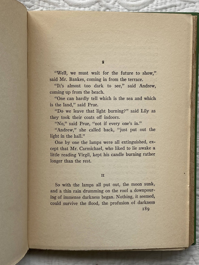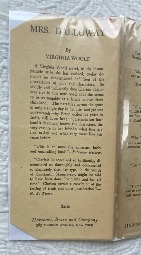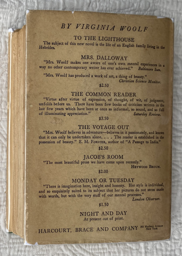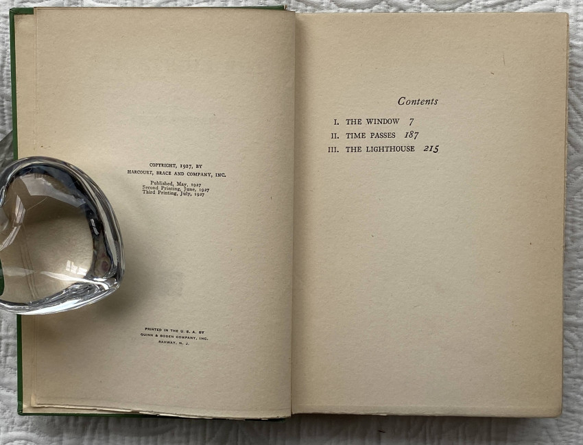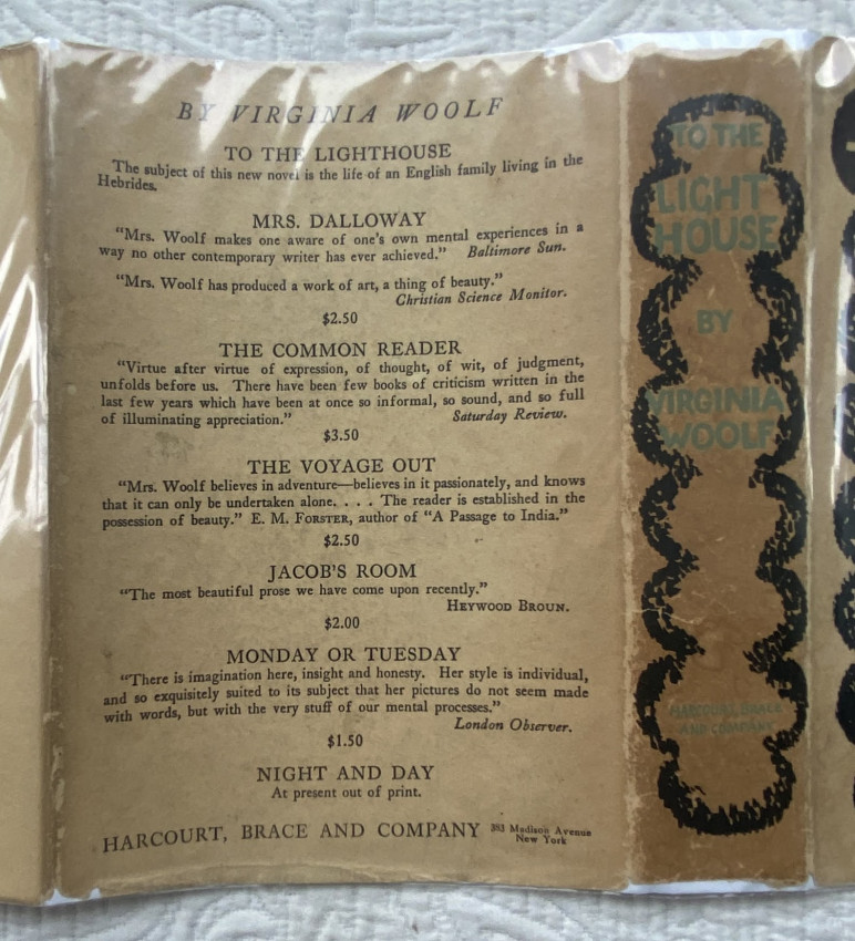 First U.S. edition, the third printing from July, 1927. A masterpiece, one of Virginia Woolf’s "few novels where something happens, written at the height of her luminous Impressionist vision. The sunniest of her books and shows the obsession with rendering the passage of time which dominated her later work.” (Connolly). Cf. Woolmer 154 (1st UK ed); cf. Connolly 100, The Modern Movement, no. 54.