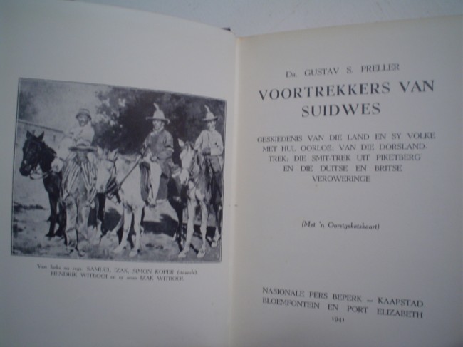 Voortrekkers van Suidwes: Oorspronklik uitgegee as 'n volume uit die Kwarteeu-Serie. 1941 eerste uitgawe met 378 bladsye. Oorsigsketskaart agterin. geskiedenis van die land en sy volke met hul oorloe, van die Dorslandtrek, die Smit-trek uit Piketberg en die Duitse en Britse veroweringe.