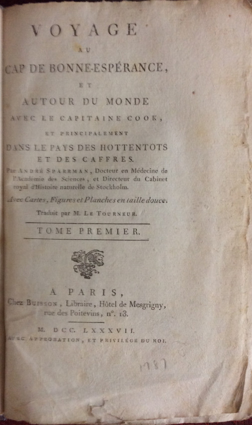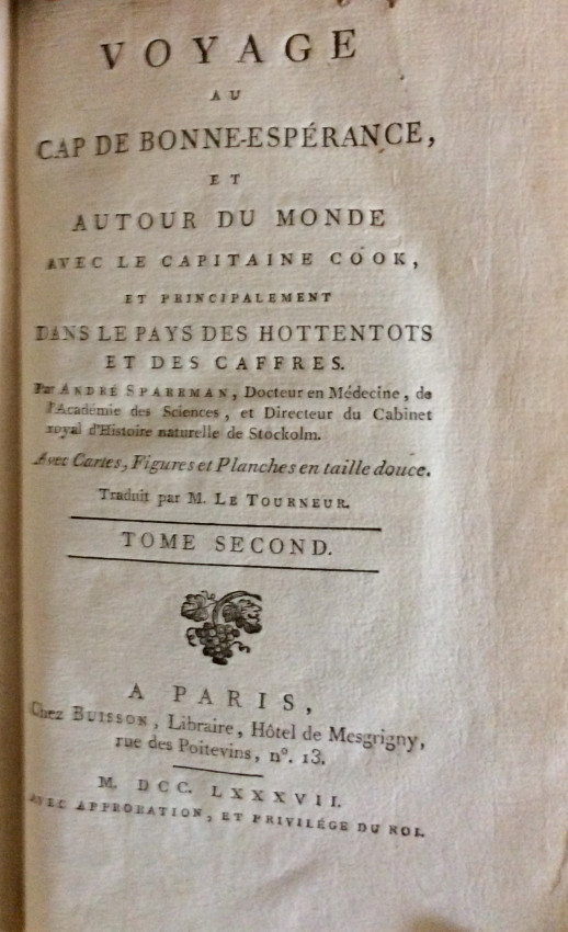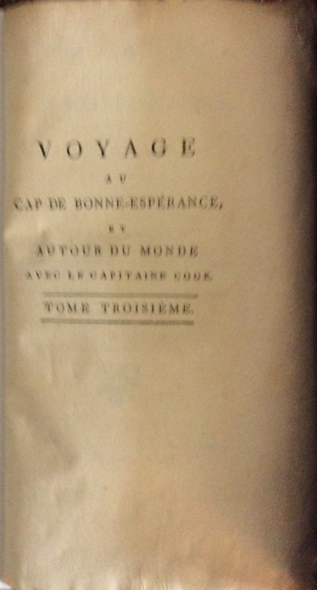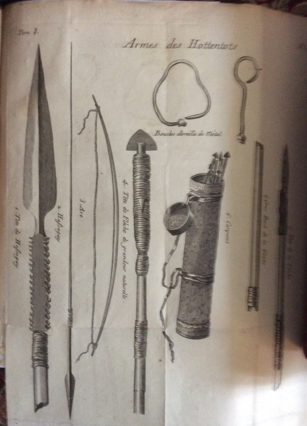 - Vol III. Title-page and 340 pp of text, pp 341 pp of Hottentot and Caffre vocabularies, pp 347-351 of contents, pp 352-366 index of all volumes and errata, pp 367-371 pp of Privilege du Roi (colophon); plus 6 multifold plates at the back