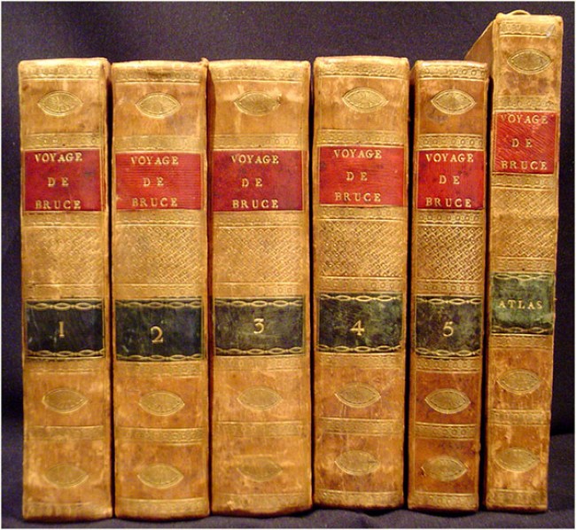 5 volumes + atlas of maps and plates, I. lxxxiii, 620. II. (iv), 784. III. (iv), 858. IV. (iv), 752. V. (iv), 328, clxiii pages. VI, 4 large folding maps, 65 engraved plates (including 7 engraved leaves of texts) numbered 1 - 65. 19 folding plates numbered 70 - 88 which accompany Paterson\'s text. Contemporary tree calf, gilt decorated spines with red and green title labels - the leather is lightly rubbed along the edges, marbled endpapers - some transfer of staining from the endpapers onto the half title and title pages (see illustration 2 below), contents bright - overall a very good set.