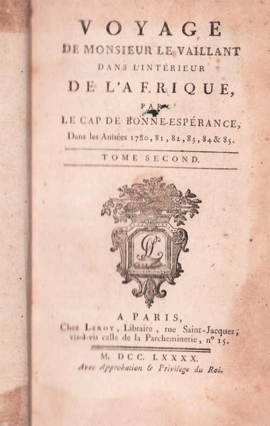 Ogilvie ( J.H.) A Bibliography of Le Vaillant’s Voyages and Oiseaux D’Afrique, (1962), number 3. All the plates are present but bound in on different pages to Ogilvie’s references.