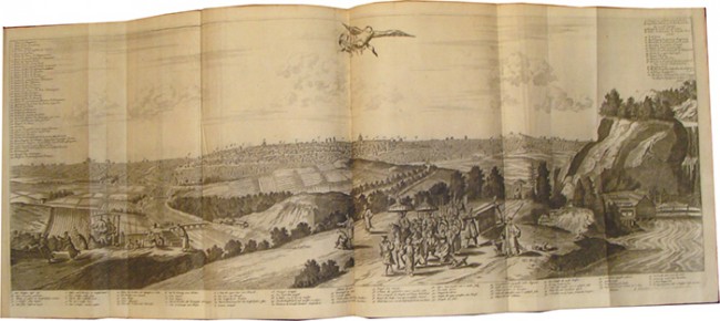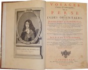 2 volumes in 1, printed in double columns, I. (xxx), 440 columns. II. 445 - 808 columns, (72 table des matieres), (1 privilegie) pages, half title pages, engraved portrait of the author, title page printed in red and black, 12 engraved folding maps and 6 single page maps by Pierre vander Aa, 4 maps in the text, 19 foldling plates including the large panorama of Iedo (Tokyo) and 3 plans of Goa, Materan & Batavia, 5 single page plates and 15 illustrations in the text, half calf with sprinkled paper sides (which are a little rubbed and worn around the edges) and sprinkled page edges, the two title pages are slightly browned, a few pages lightly browned and spotted but overall the contents are crisp.